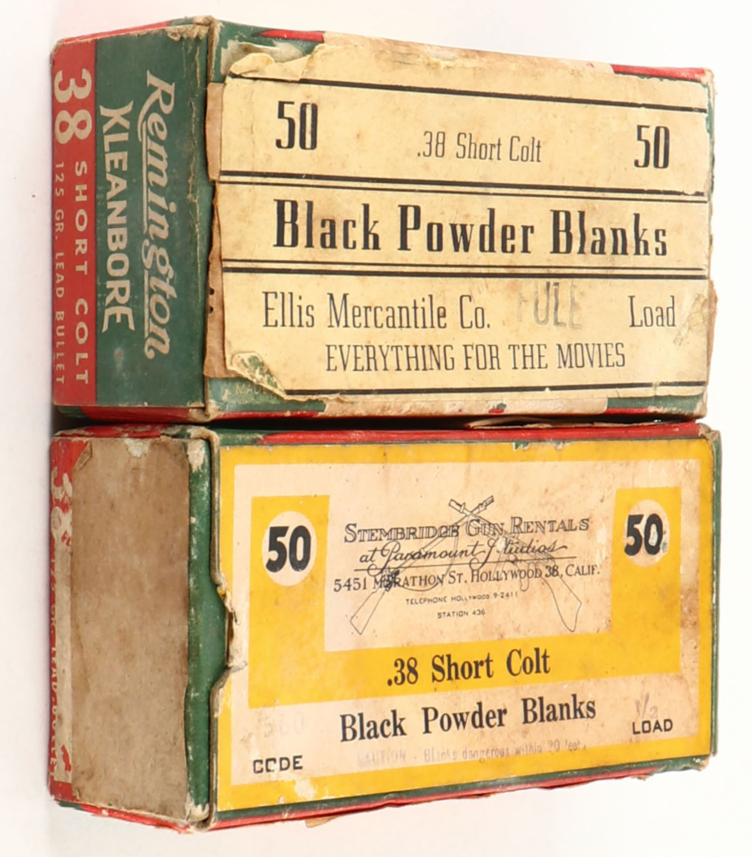 Stembridge Gun Rentals Inc., Lot of (2), .38 Short Colt, Black Powder Blanks from the famous Hollywood gun rental company, Appear Partial, 2pc., multi-colored boxes, boxes have scuffing, ammo is good. Grade: Good ++ - Value: 16 to 60