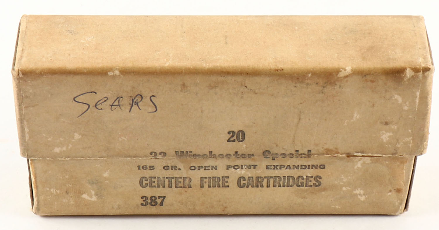 Unknown Mfg., .32 Winchester Special, 165 Grain Open Point Expanding, Partial 15rds., 2pc, buff box with black print, box has scuffing with light age soiling, ammo is very good. Grade: Very Good - Value: 30 to 90