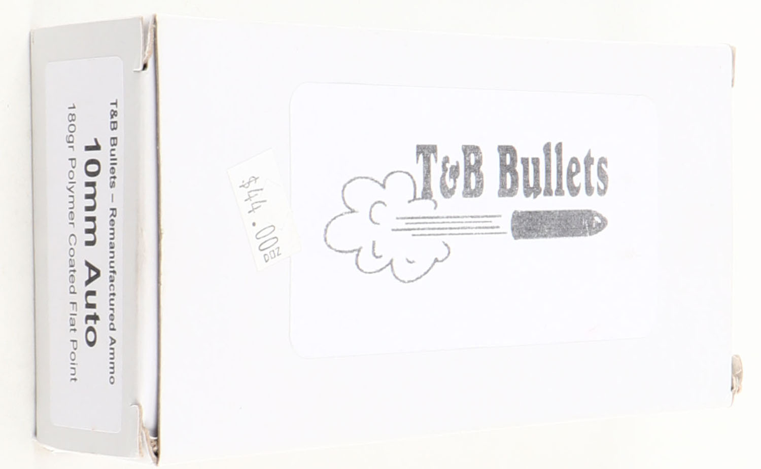 Unknown Mfg., 10mm Auto, 180 Grain Polymer Coated Flat Point, Full, 1pc, white box is very solid, ammo is excellent. Grade: Excellent - Value: 10 to 50