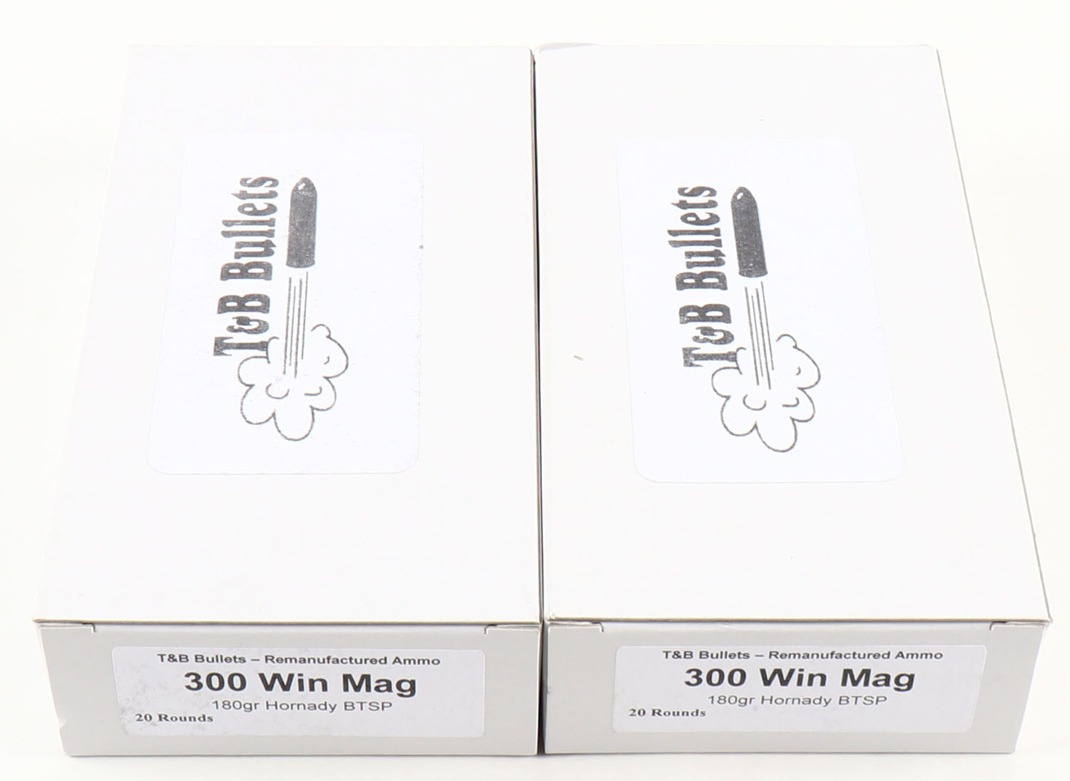 T&B Bullets, Lot of (2), .300 Win. Mag ammo boxes, Remanufactured Ammo by a class type 7 Ammo MFG (this is the same class (high quality) as Winchester, Federal and or CCI), 180 Grain Hornady BTSB bullet, loaded cartridges, Full, 1pc, white box is very solid, ammo is minty. Grade: Excellent ++ - Value: 20 to 80