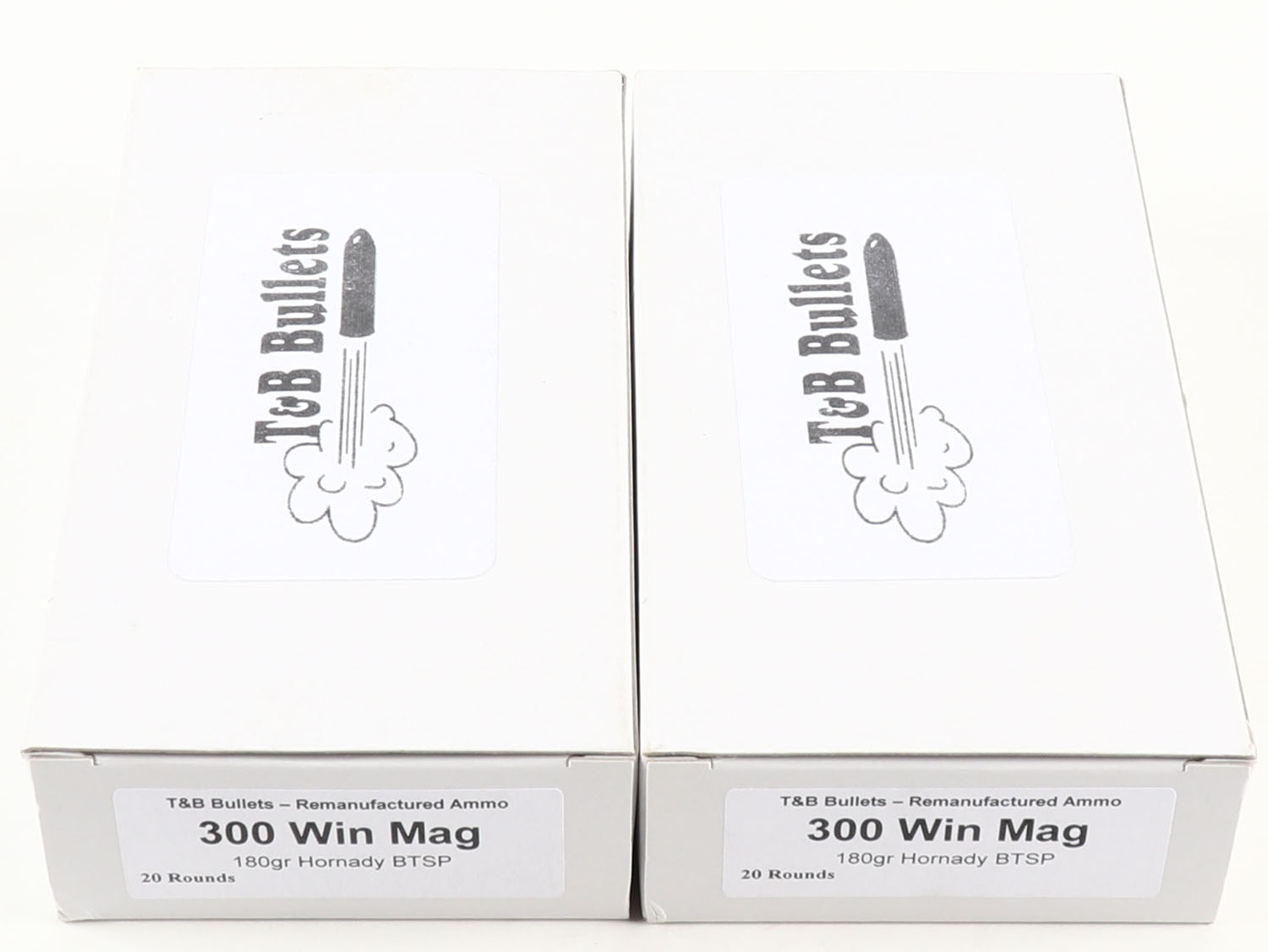 T&B Bullets, Lot of (2), .300 Win. Mag ammo boxes, Remanufactured Ammo by a class type 7 Ammo MFG (this is the same class (high quality) as Winchester, Federal and or CCI), 180 Grain Hornady BTSB bullet, loaded cartridges, Full, 1pc, white box is very solid, ammo is minty. Grade: Excellent ++ - Value: 20 to 80