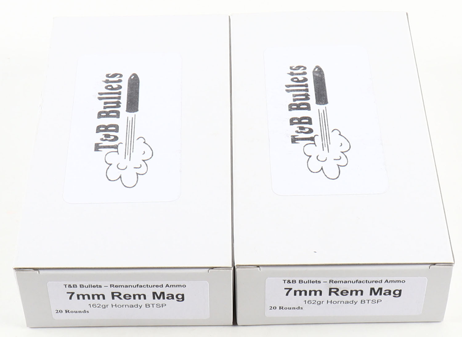 T&B Bullets, Lot of (2), 7mm Rem. Mag ammo boxes, Remanufactured Ammo by a class type 7 Ammo MFG (this is the same class (high quality) as Winchester, Federal and or CCI), 162 Grain Hornady BTSP bullet, loaded cartridges, Full, 1pc, white boxes are very solid, ammo is minty. Grade: Excellent ++ - Value: 20 to 80