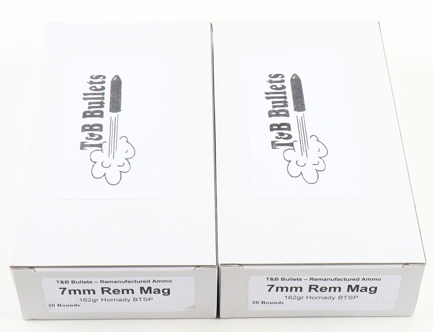 T&B Bullets, Lot of (2), 7mm Rem. Mag ammo boxes, Remanufactured Ammo by a class type 7 Ammo MFG (this is the same class (high quality) as Winchester, Federal and or CCI), 162 Grain Hornady BTSP bullet, loaded cartridges, Full, 1pc, white boxes are very solid, ammo is minty. Grade: Excellent ++ - Value: 20 to 80