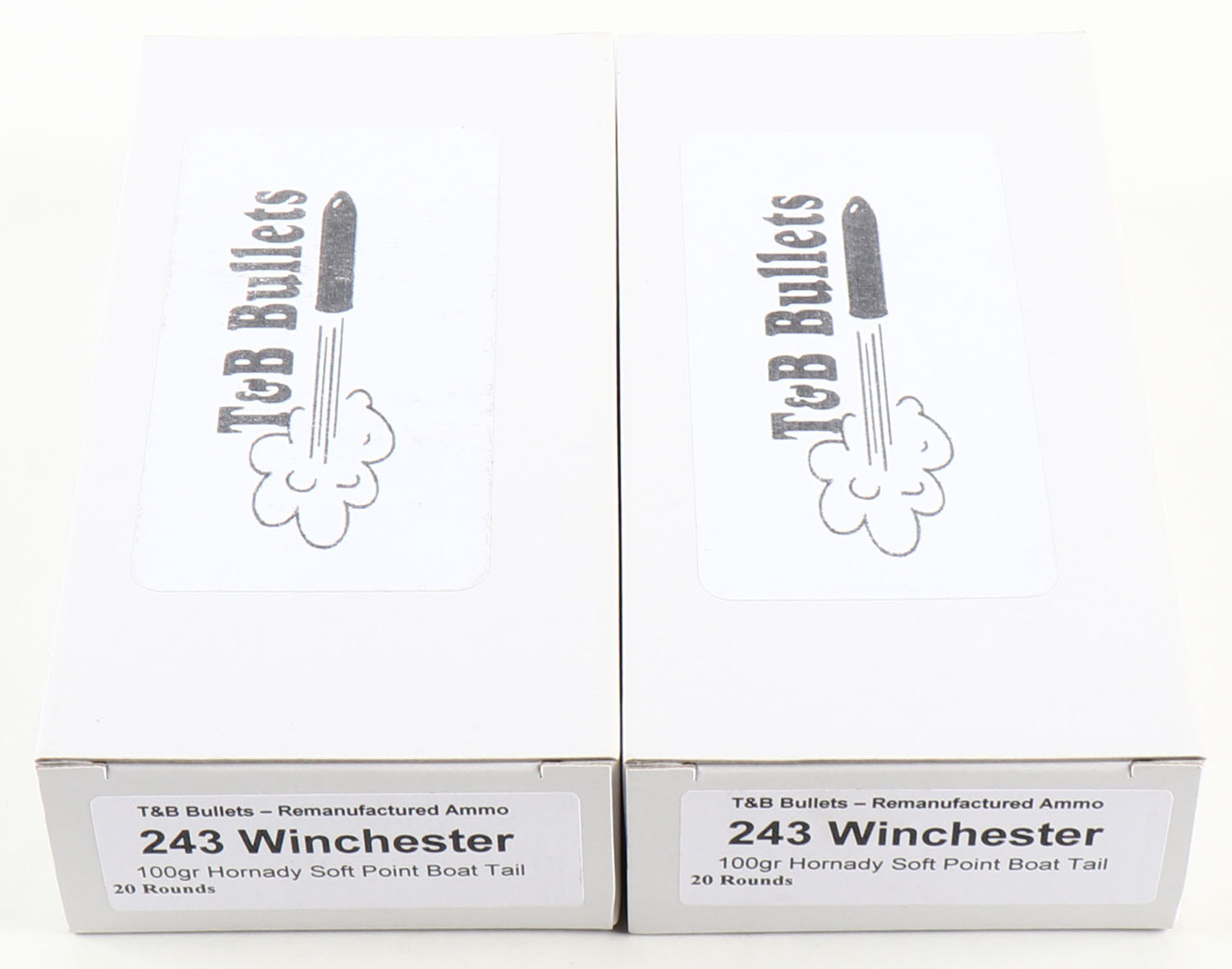 T&B Bullets, Lot of (2), .243 Winchester ammo boxes, Remanufactured Ammo by a class type 7 Ammo MFG (this is the same class (high quality) as Winchester, Federal and or CCI, 100 Grain Hornady BTSP bullet, loaded cartridges, Full, 1pc, white boxes are very solid, ammo is minty. Grade: Excellent ++ - Value: 20 to 80