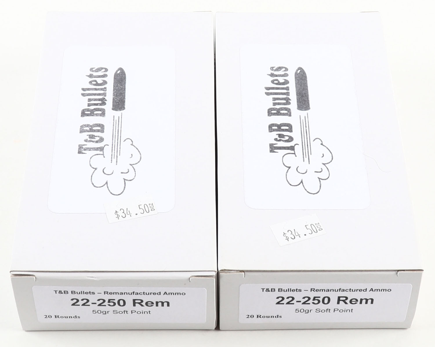 T&B Bullets, Lot of (2), .22-250 Rem ammo boxes, Remanufactured Ammo by a class type 7 Ammo MFG (this is the same class (high quality) as Winchester, Federal and or CCI), 50 Grain Soft point bullet, loaded cartridges, Full, 1pc, white boxes are very solid, ammo is minty. Grade: Excellent ++ - Value: 20 to 80