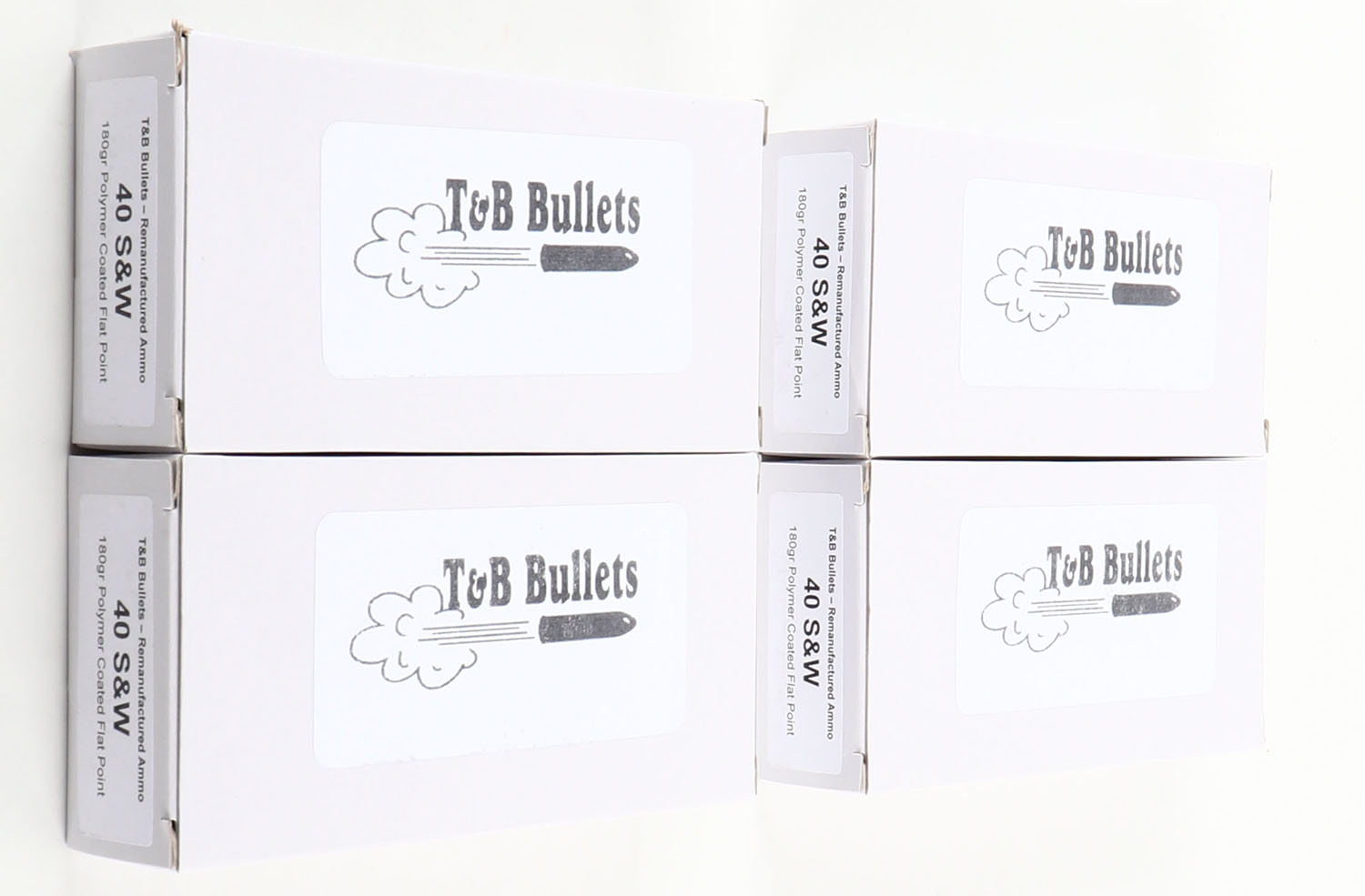 T&B Bullets, Lot of (4), .40 Smith & Wesson ammo boxes,, Remanufactured Ammo by a class type 7 Ammo MFG (this is the same class (high quality) as Winchester, Federal and or CCI), 180 Grain Polymer Coated Flat Point bullet, loaded cartridges, 1pc, Full 50 count boxes, white boxes are very solid, ammo is minty. Grade: Excellent ++ - Value: 20 to 100