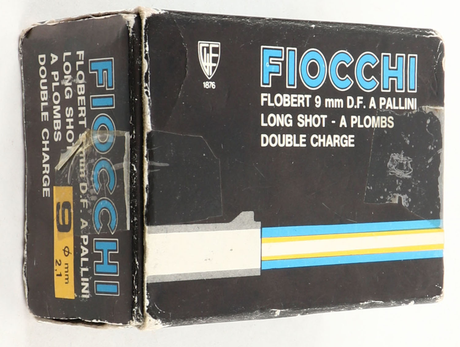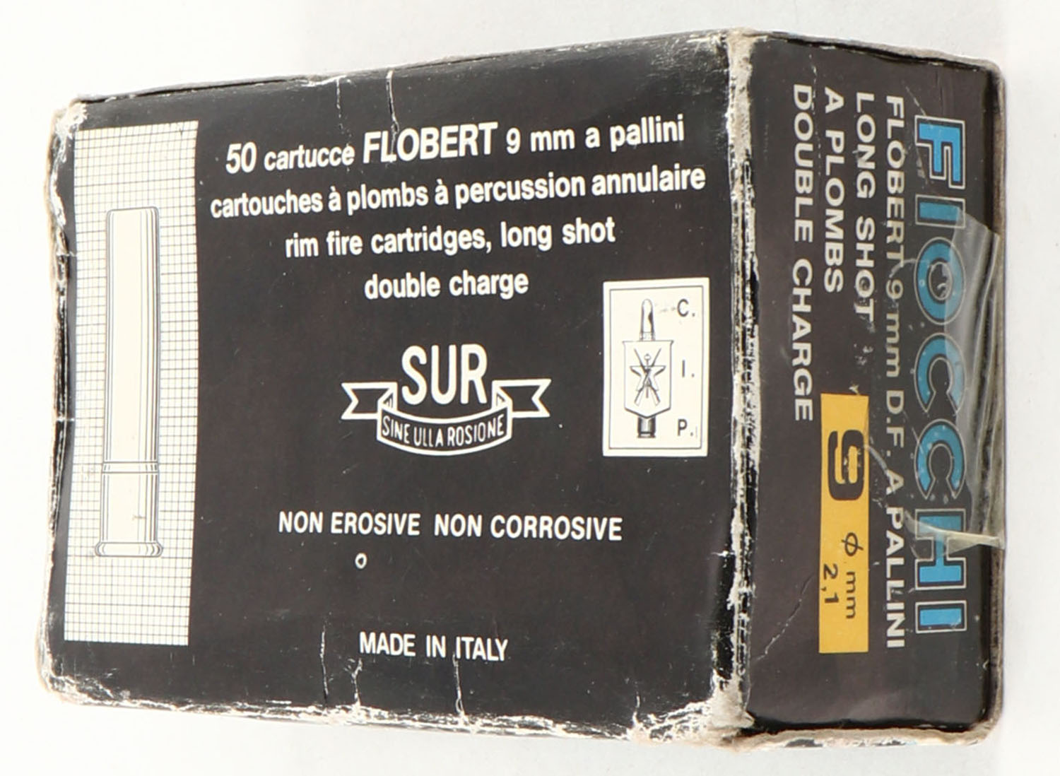 Fiocchi, Flobert, 9mm, Longshot Double Charge R.F., Full, 1pc, multi-colored box, box has age soiling with scuffing, ammo is excellent. Grade: Very Good - Value: 20 to 40
