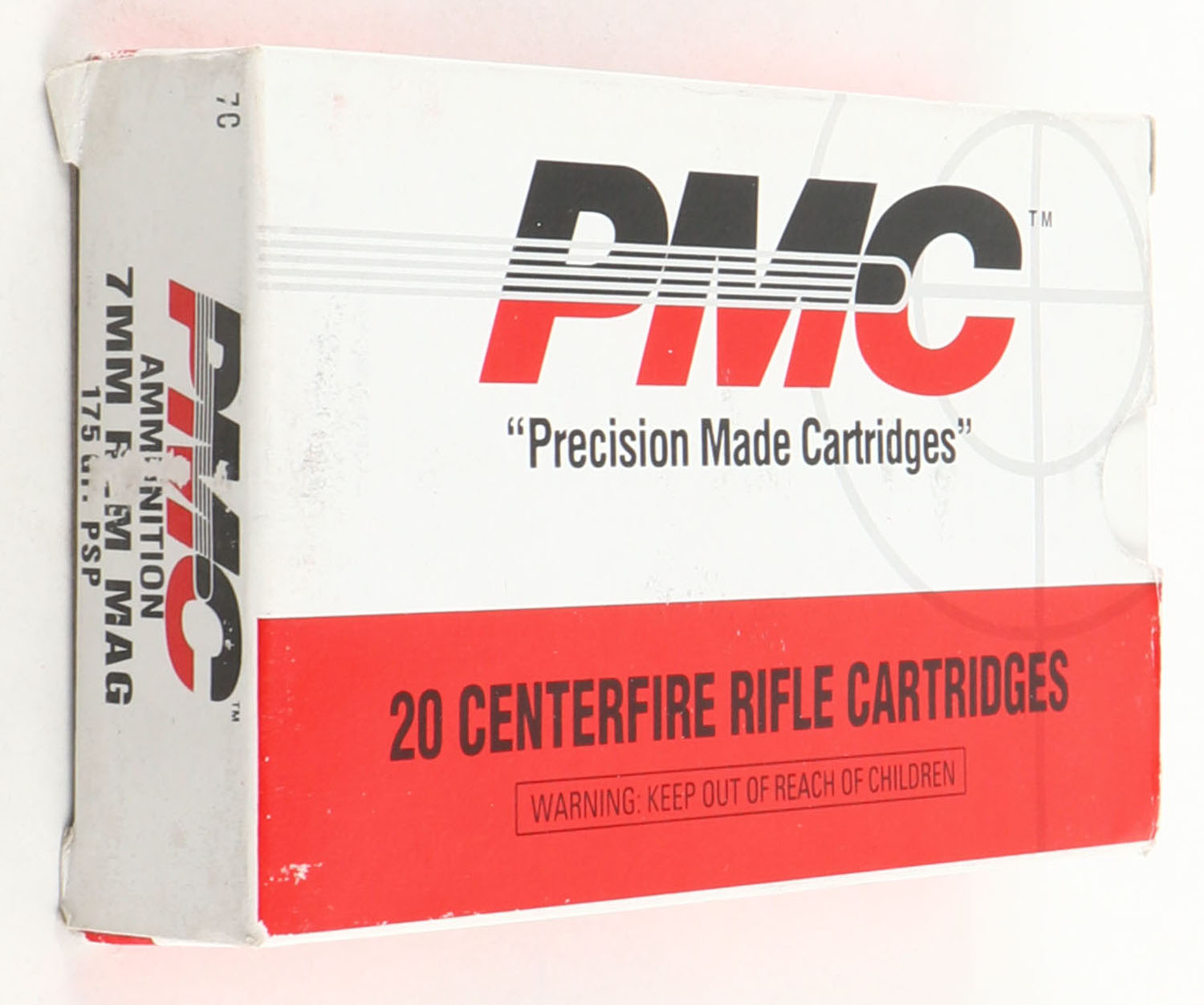 PMC, 7mm Remington Mag., 175 Grain PSP, Full, 1pc, white, black & red box, box is very solid, ammo is excellent. Grade: Excellent + - Value: 10 to 50