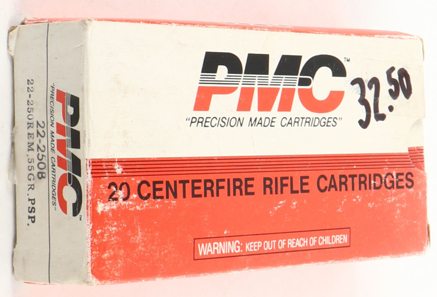 PMC, 22-250 Rem., 55 Grain PSP, Full with 7rds. Being correct H/S, 1pc, white, red & black box, box has age soiling, ammo is very good. Grade: Good ++ - Value: 8 to 40