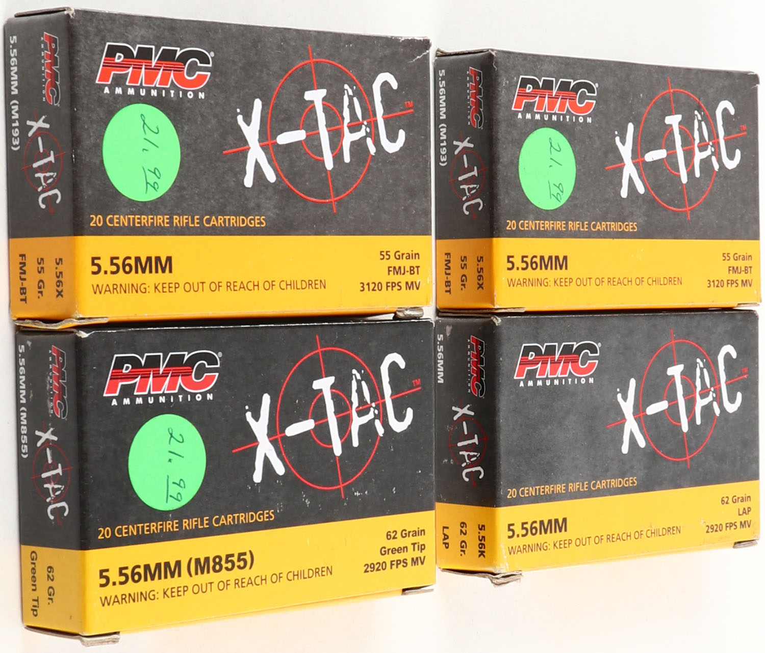 PMC, Lot of (4 ), X-Tac, 5.56 Nato, 55 Grain FMJ-BT, Full, 1pc., multi-colored boxes, boxes are solid with excellent color, Ammo is excellent. Grade: Excellent ++ - Value: 10 to 50