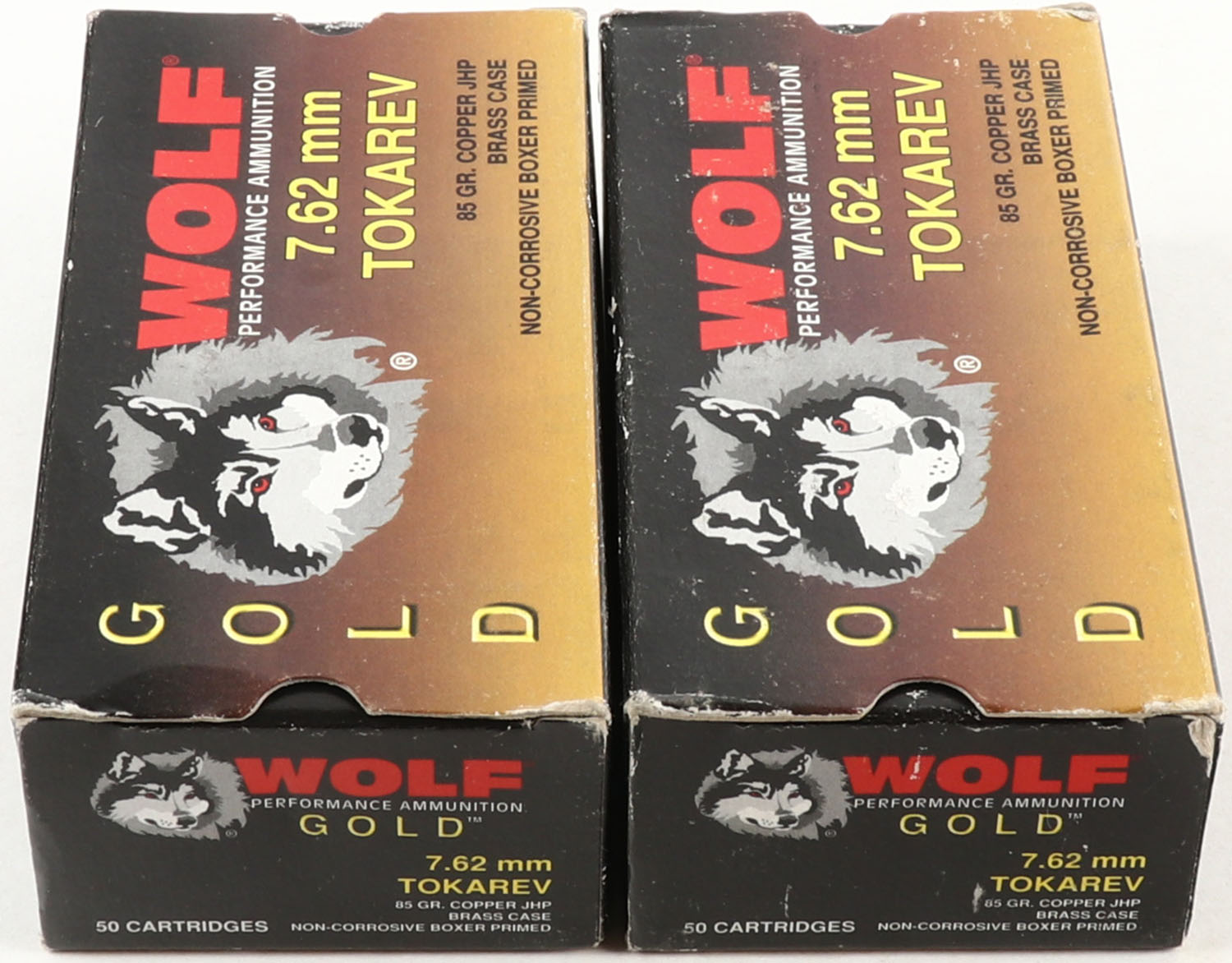 Wolf, Lot of (2), 7.62mm Tokarev, 85 Grain Copper JHP, Full, 1pc, multi-colored boxes, boxes are very solid, ammo is minty. Grade: Excellent - Value: 10 to 50