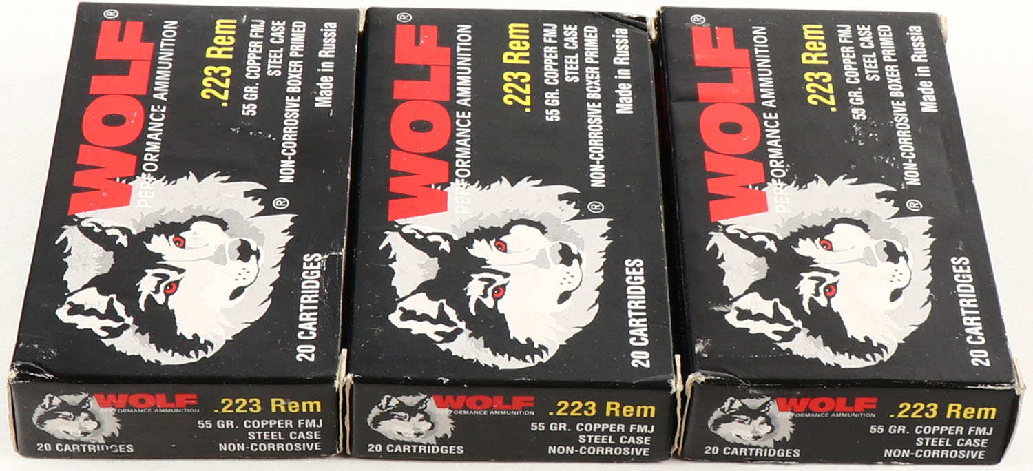 Wolf, Lot of (3), 223 Rem, 55 Grain Copper FMJ, Full, 1pc., Multi-colored box, box is solid with excellent color, Ammo is excellent. Grade: Excellent - Value: 20 to 50