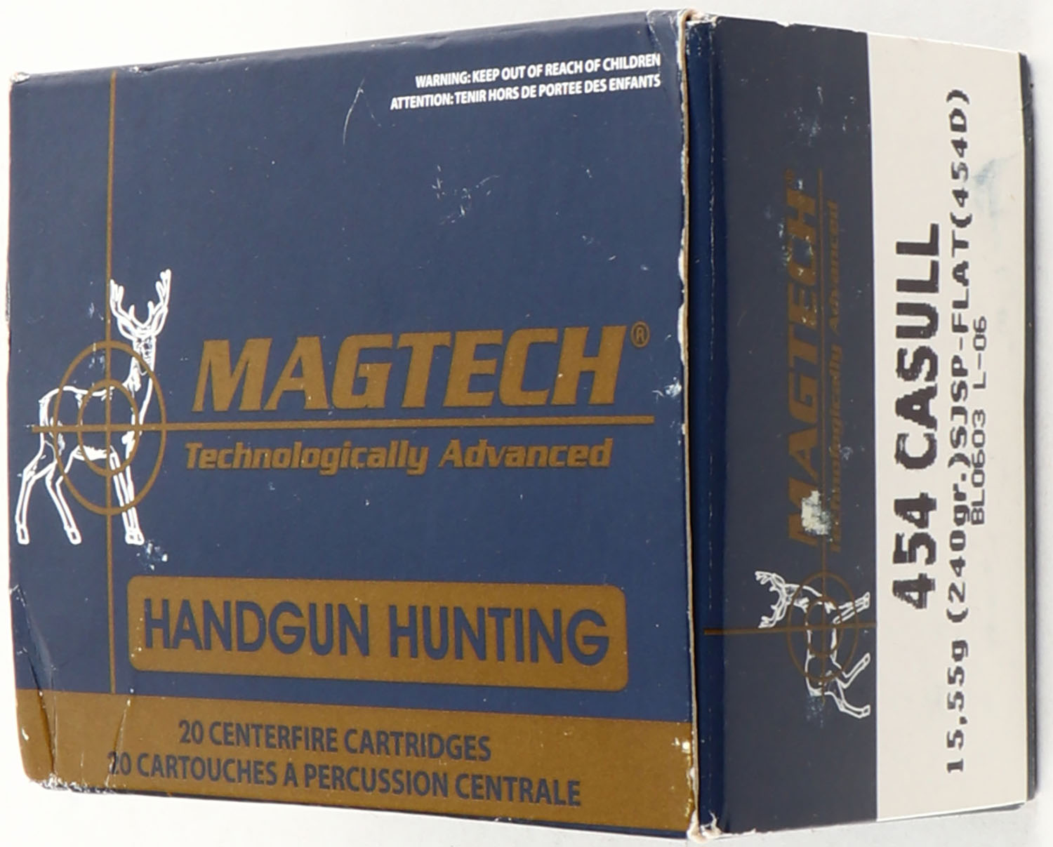 Magtech, 454 Casull, 240 Grain SJSP-Flat, Full, 1pc, blue & gold box, box is very solid, ammo is excellent. Grade: Excellent - Value: 20 to 60