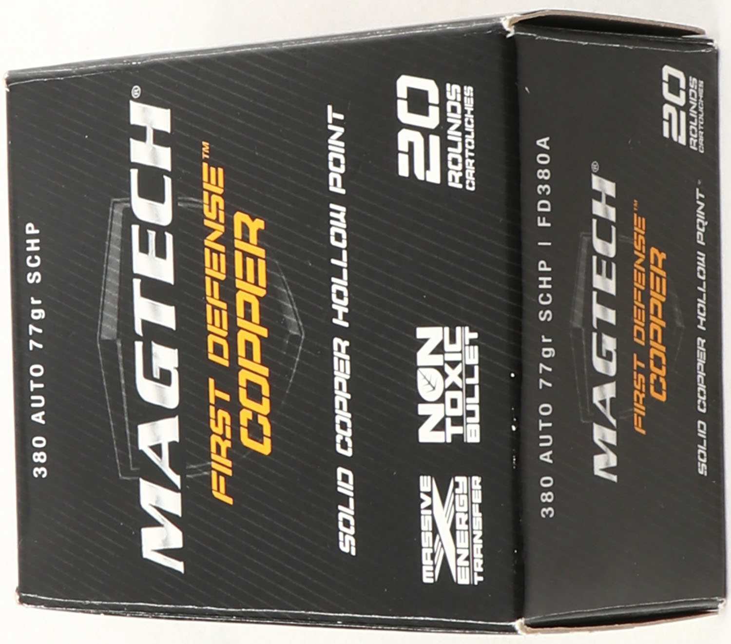 Magtech, First Defense Copper, 380 Auto, 77 Grain SCHP, Full, 1pc, multi-colored box, box is minty, ammo is minty. Grade: MINT - Value: 20 to 40
