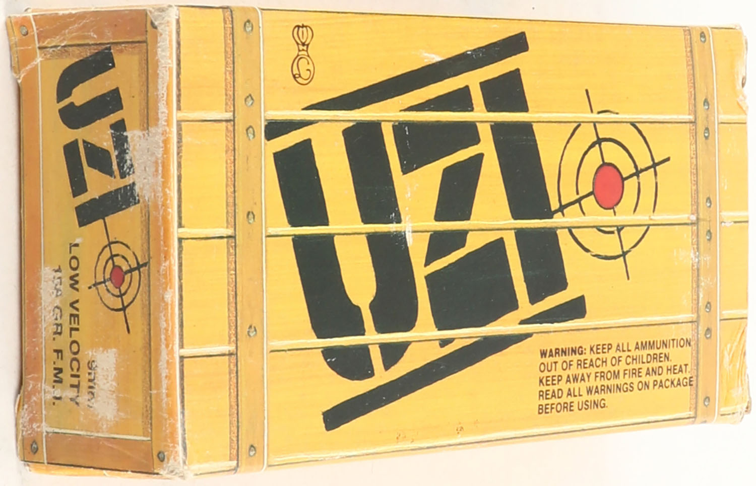 Uzi, 9mm Low Velocity, 158 Grain FMJ, Full, 1pc. H/S reads 9mm TZZ 86, Brown box, box is solid with excellent color, ammo is excellent. Grade: Excellent - Value: 20 to 60