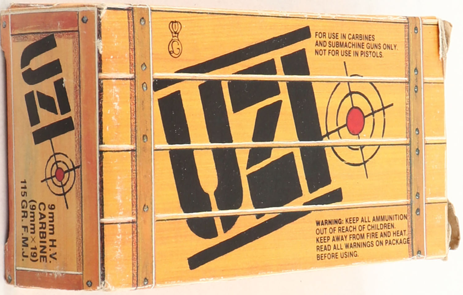 Uzi, 9mm H.V Carbine, (9mm x 19), 115 Grain FMJ, Full, 1pc. Brown box, box is solid with excellent color, ammo is minty. Grade: Excellent + - Value: 20 to 60