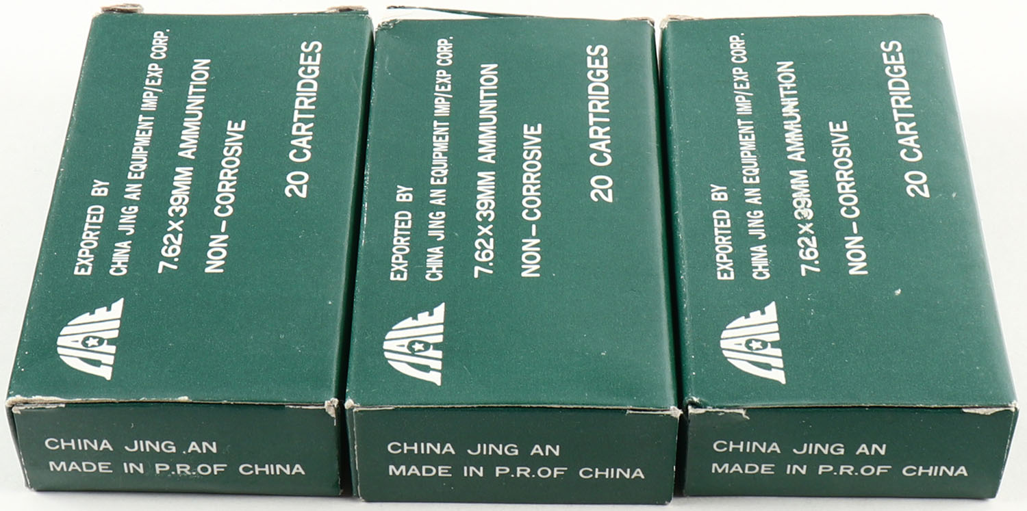 China Jing, Lot of (3), 7.62 x 39mm, Full, 1pc. Green boxes, boxes are solid with excellent color, ammo is minty. Grade: Excellent + - Value: 16 to 60