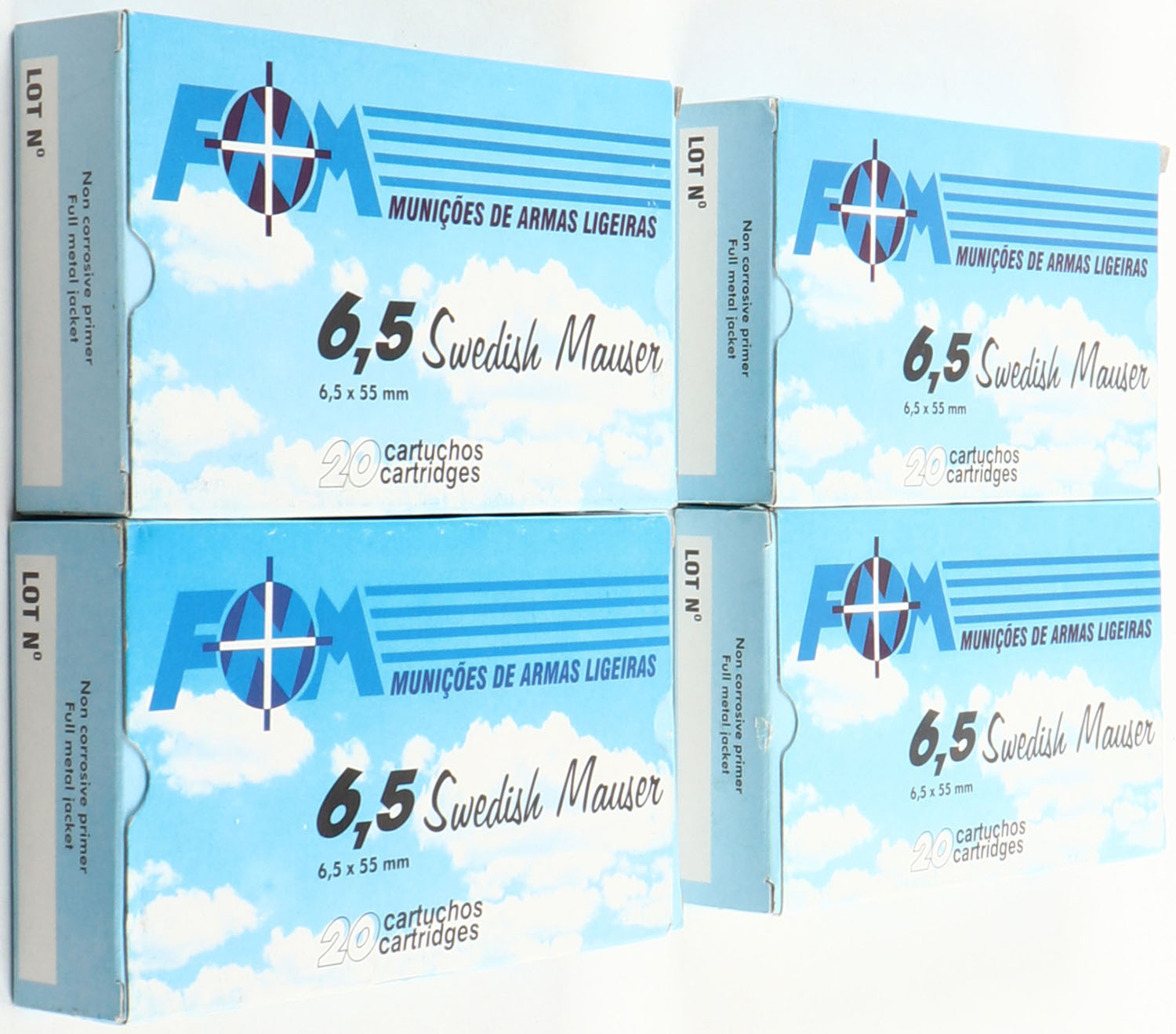 Municoes de Armas Ligeiras, Lot of (4) 6.5 Swedish Mauser, 139 Grain Full Metal Jacket, 1pc. Blue & white boxes, boxes are very solid with excellent color, ammo is minty. Grade: MINT - Value: 40 to 100