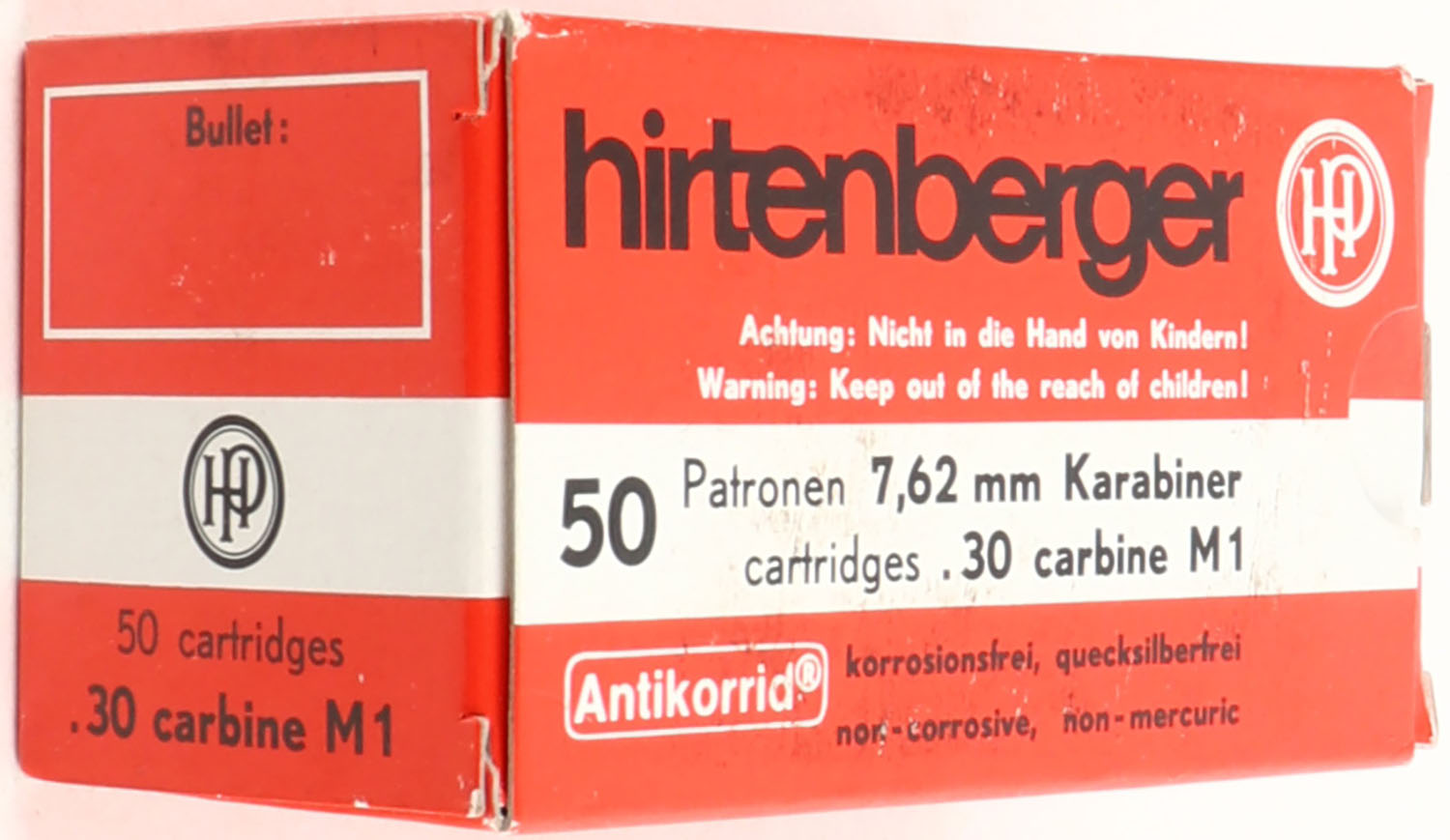 Hirtenberger, 7.62mm Karabiner (.30 Carb M1), Full, 1pc, Multi-colored box, box is very solid, ammo is excellent. Grade: Excellent ++ - Value: 20 to 60