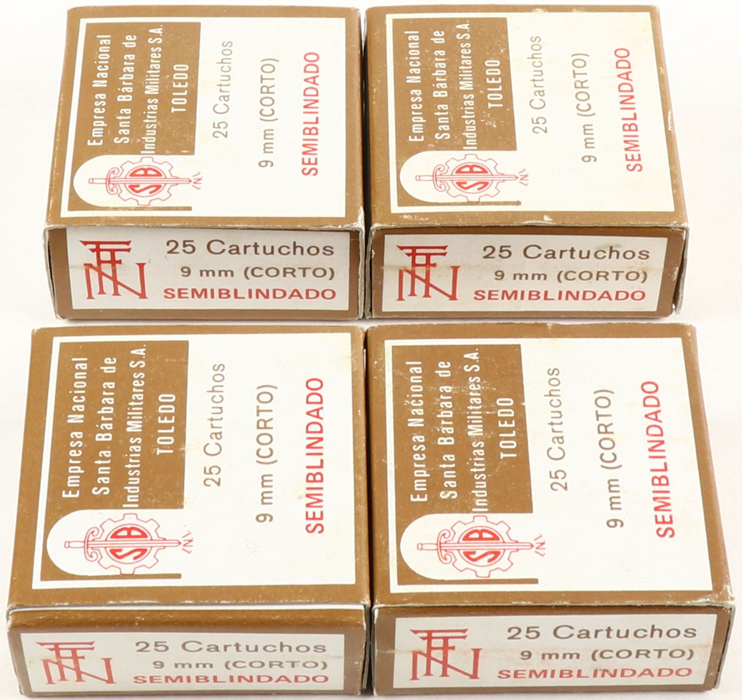 Empresa Nacional, Lot of (4), 9mm Corto (.380 ACP), Semi-Jacketed, Full, 1pc. White & brown boxes, boxes are solid with excellent color, ammo is minty. Grade: Excellent - Value: 30 to 60