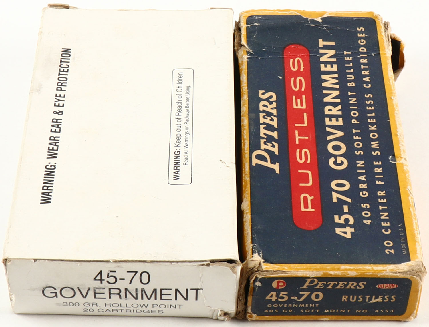 Mixed Mfg., 45-70 Government, Lot of (2), Peters box is partial 15rds, white box is partial 14rds., boxes have soiling & scuffing, ammo is very good. Grade: Good ++ - Value: 20 to 100