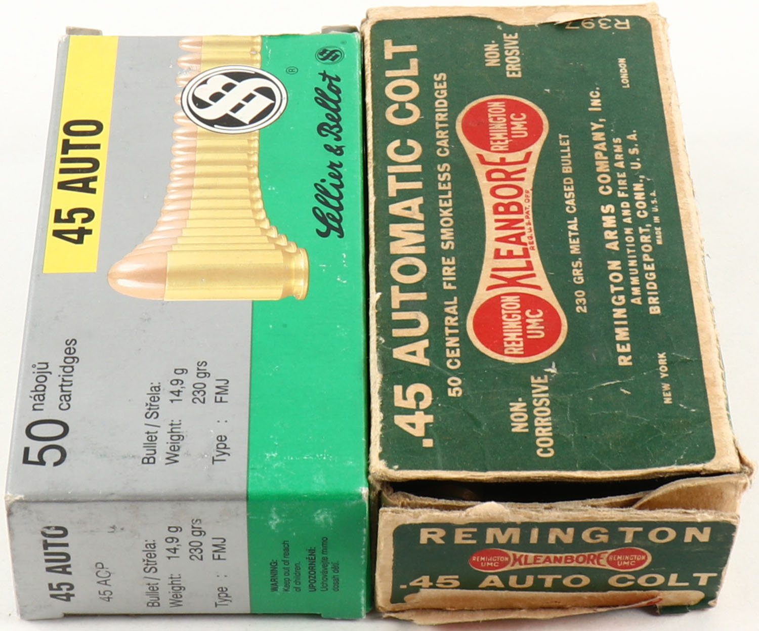 Mixed Mfg., .45 Auto, Lot of (2), Rem-UMC box is partial 33rds, Sellier & Bellot box is partial 25rds, boxes are solid, ammo is very good. Grade: Very Good - Value: 20 to 60