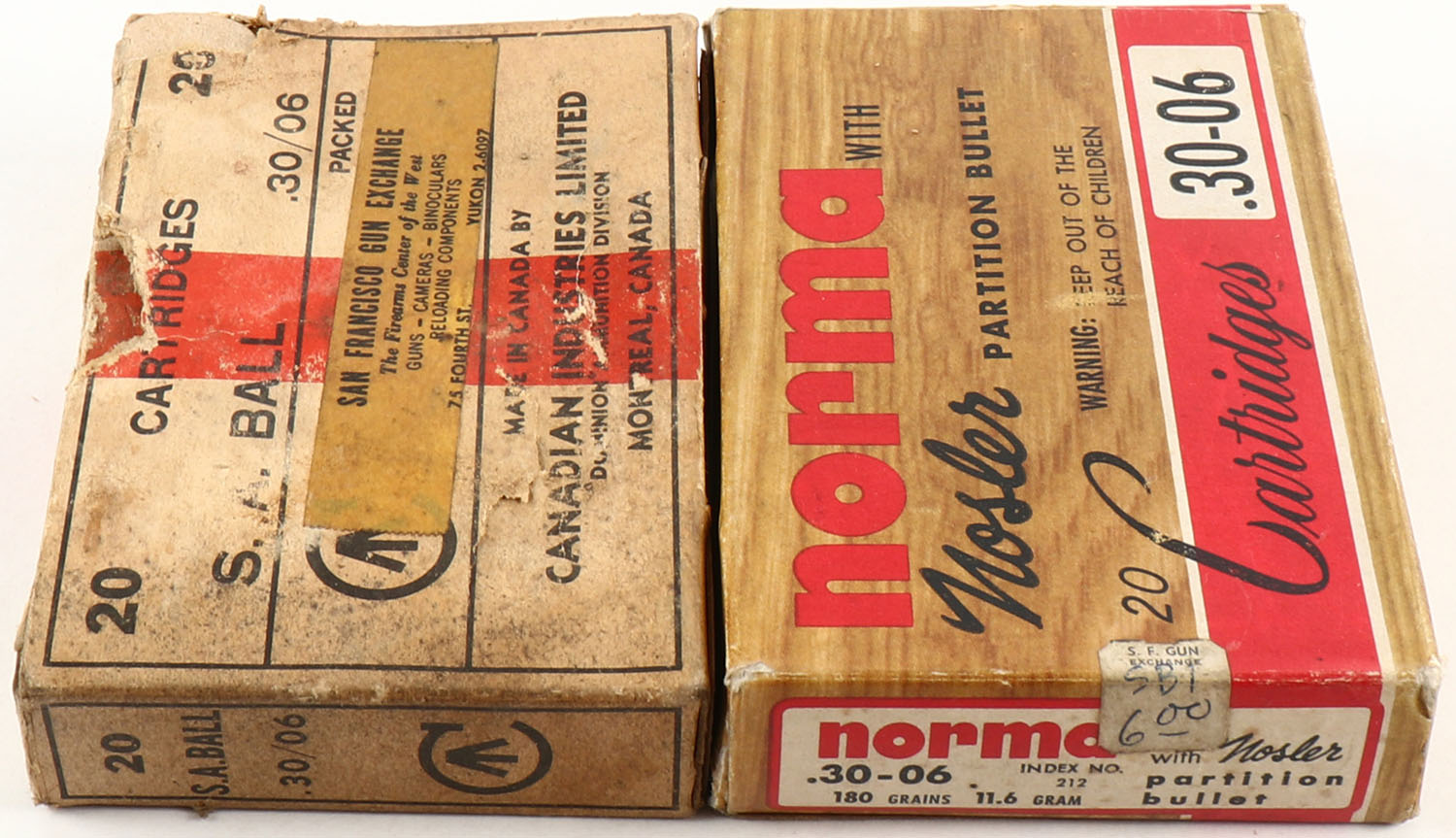 Mixed Mfg., Lot of (2), 30-06, CIL box is partial 16rds. Of mixed H/S, Norma box is partial 13rds, CIL box has scuffing with soiling other is very solid, ammo is good. Grade: Good ++ - Value: 10 to 50