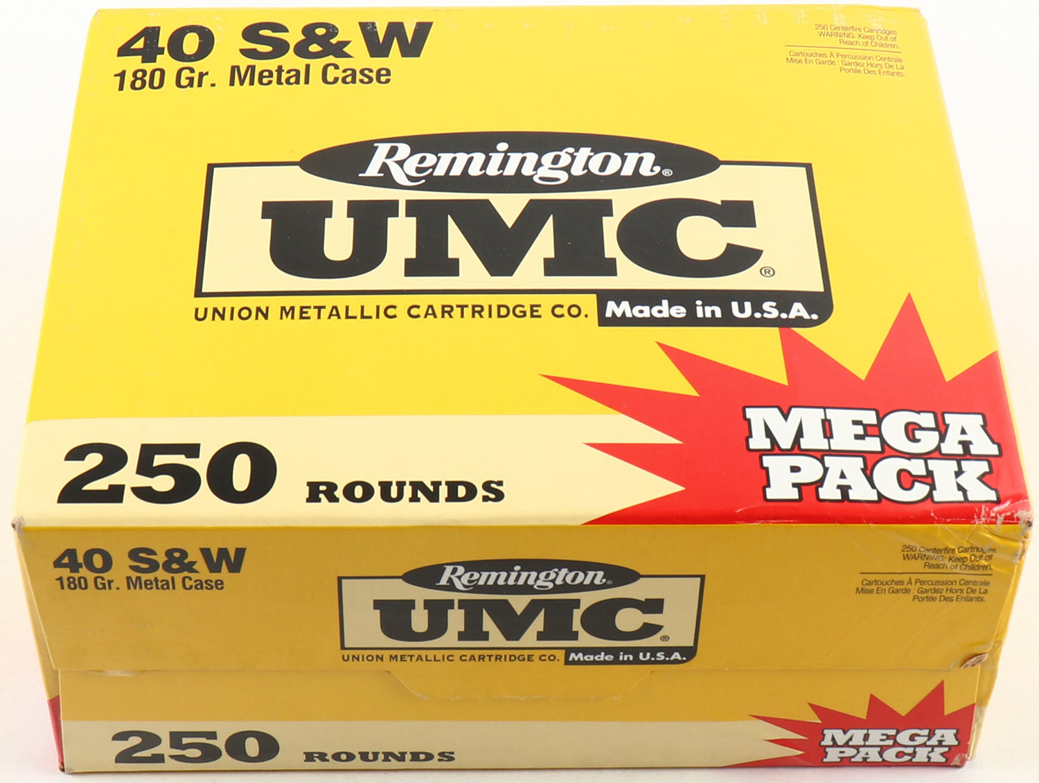 Remington UMC, .40 Smith & Wesson, 180 Grain Metal Case, FULL & SEALED, 250rds. Multi-colored case, case is very solid with minty colors. Grade: Excellent ++ - Value: 40 to 200