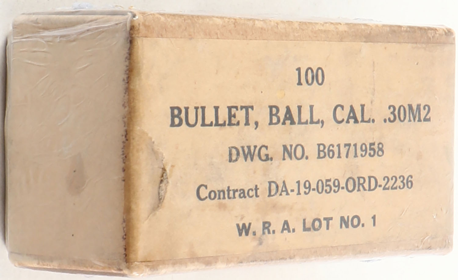 Winchester, .30M2 Bullet Ball, FULL & SEALED, 2pc. Buff box with buff label & black print, box is very solid with sharp corners, label is 100% intact. Grade: Excellent + - Value: 20 to 60