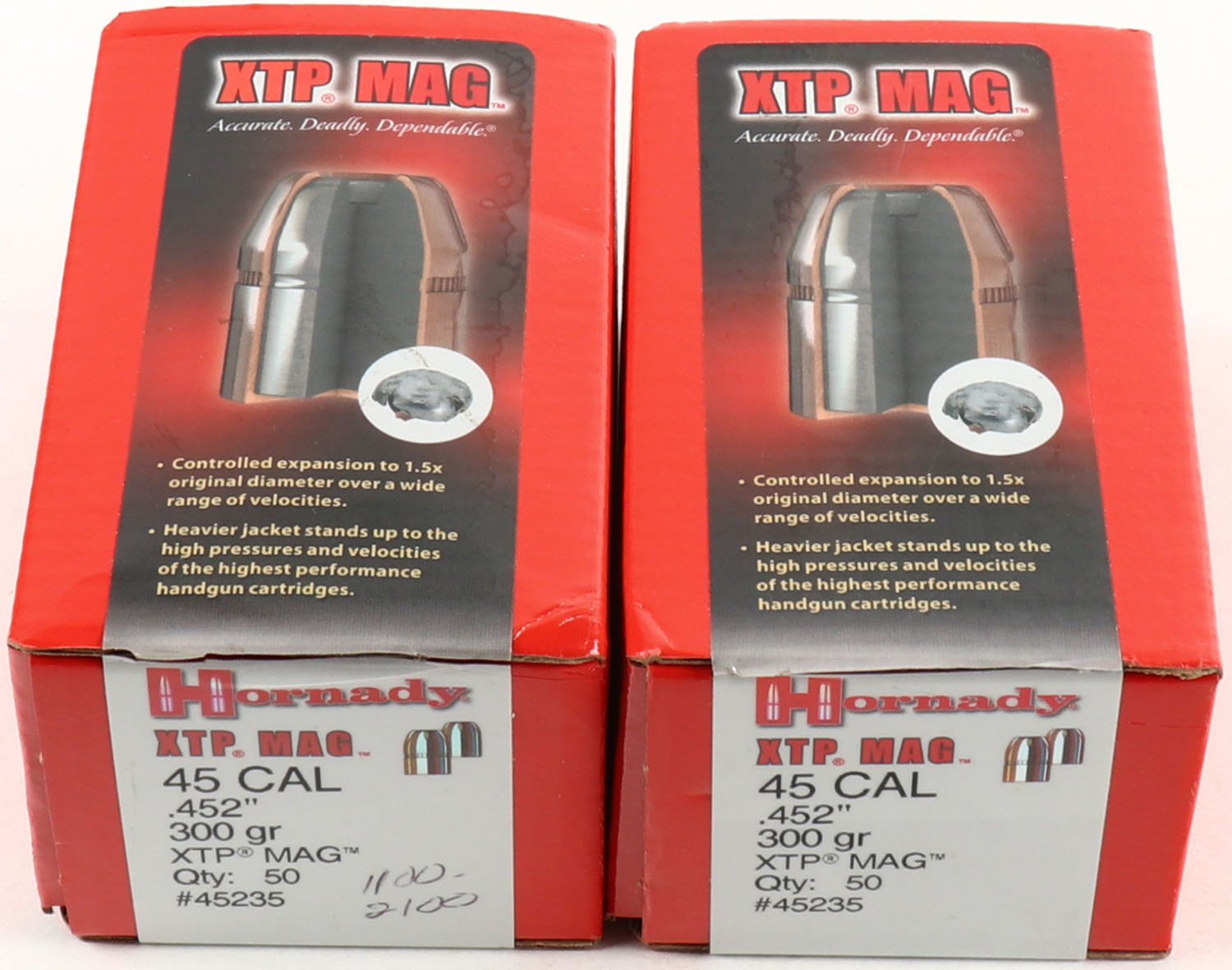 Hornady, Lot of (2), XTP Mag., 45 Cal., .452'' Dia., 300 Grain, Appears Partial, 1pc, multi-colored box, box is very solid, bullets are minty. Grade: Excellent + - Value: 10 to 60