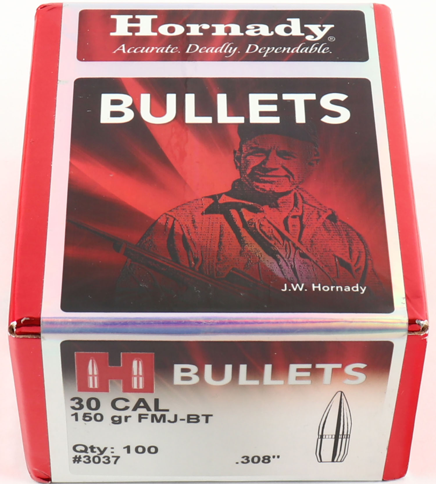 Hornady, 30 Cal., 150 Grain FMJ-BT, .308'', FULL & SEALED, 2pc, box is very solid with excellent color. Grade: Excellent ++ - Value: 10 to 40