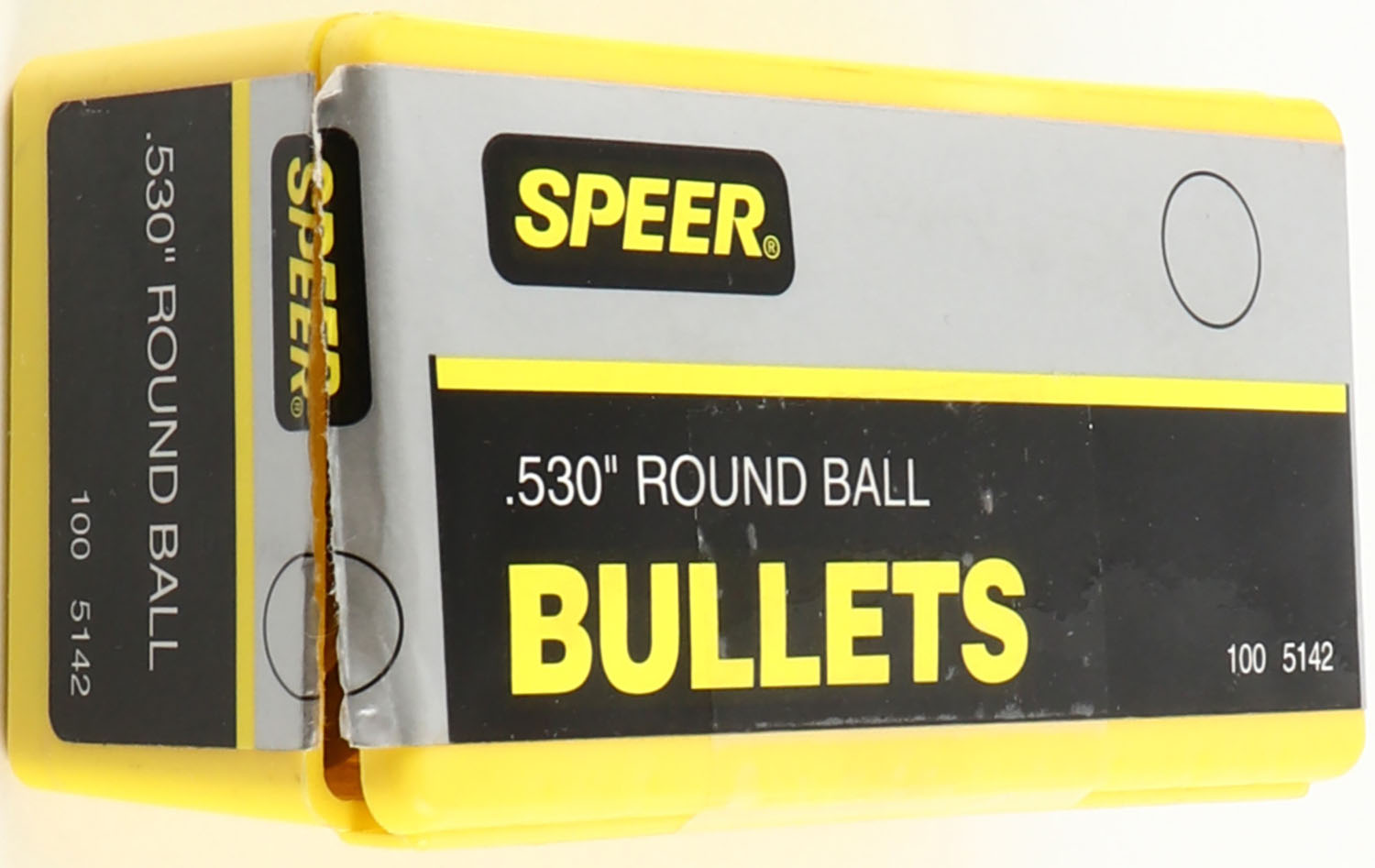 Speer, .530'' Round Ball, Partial, 1pc, multi-colored box, plastic box is very solid, bullets are excellent. Grade: Very Good - Value: 8 to 30