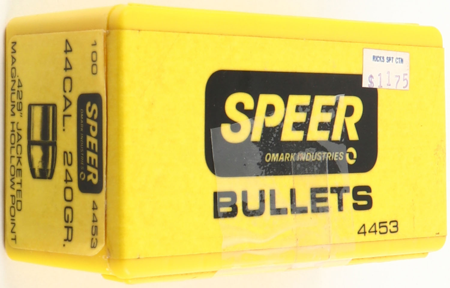 Speer, .44 Cal., 240 Grain .429'' JMHP, Yellow plastic box with black & yellow label, box is very solid. Bullets are excellent Grade: Excellent - Value: 10 to 40