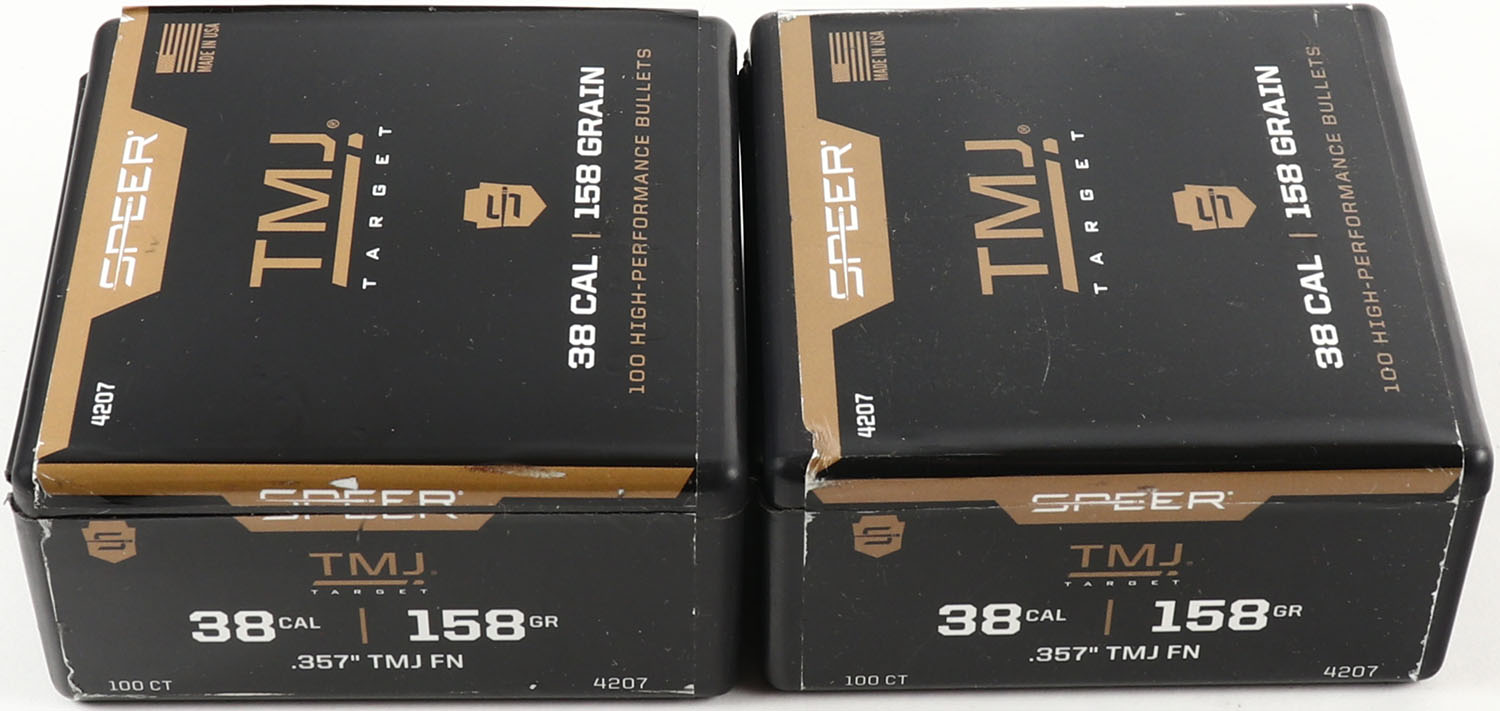 Speer, Lot of (2), TMJ, 38 Cal., 158 Grain, .357'' TMJ FN, Full, 1pc, Black Plastic boxes with brown & black label, boxes are solid, bullets are excellent. Grade: Excellent + - Value: 20 to 60