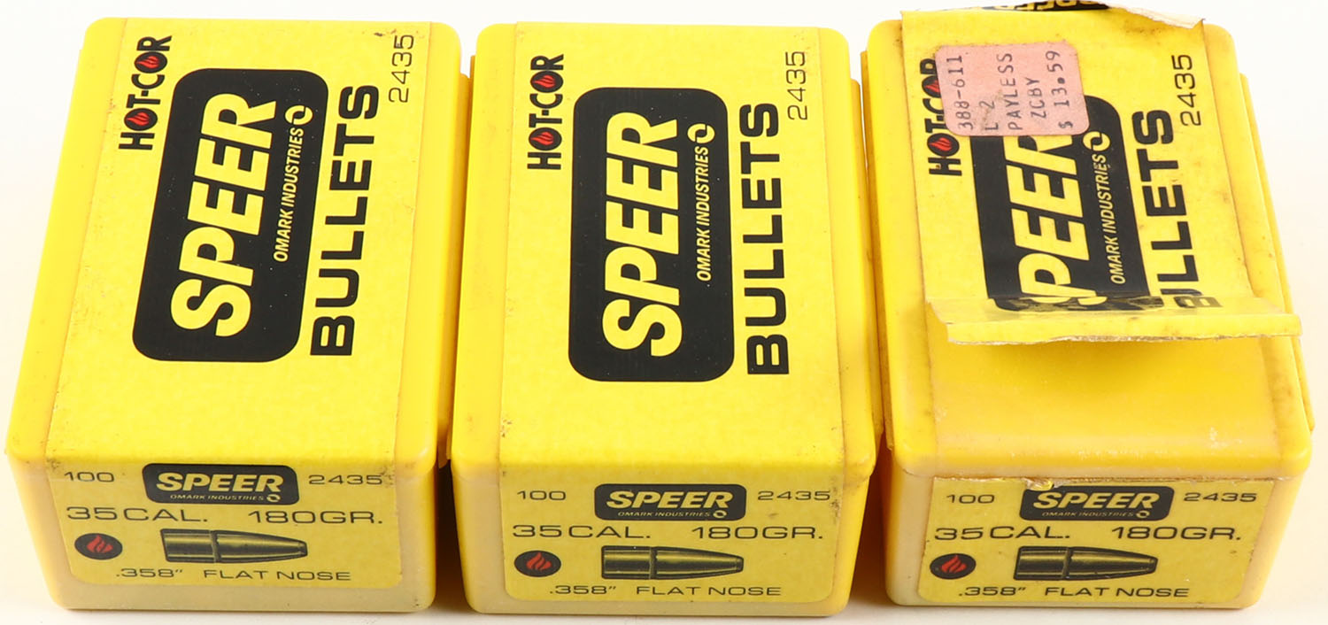 Speer, Lot of (3) 35 Cal., 180 Gr. .358'' Flat Nose, FULL & SEALED/ (1)Partial box, 1pc., boxes are solid with great color. Grade: Excellent - Value: 20 to 60