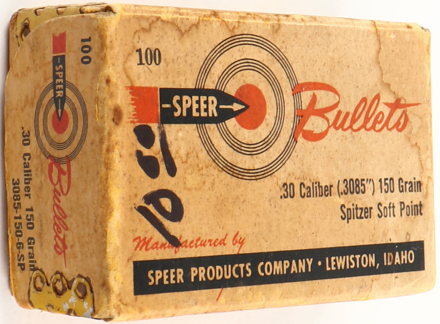 Speer, 30 Cal., 150 Grain (.3085'') Spitzer Soft Point, Full & Sealed, 1pc, multi-colored box, box has age soiling. Grade: Very Good ++ - Value: 10 to 40