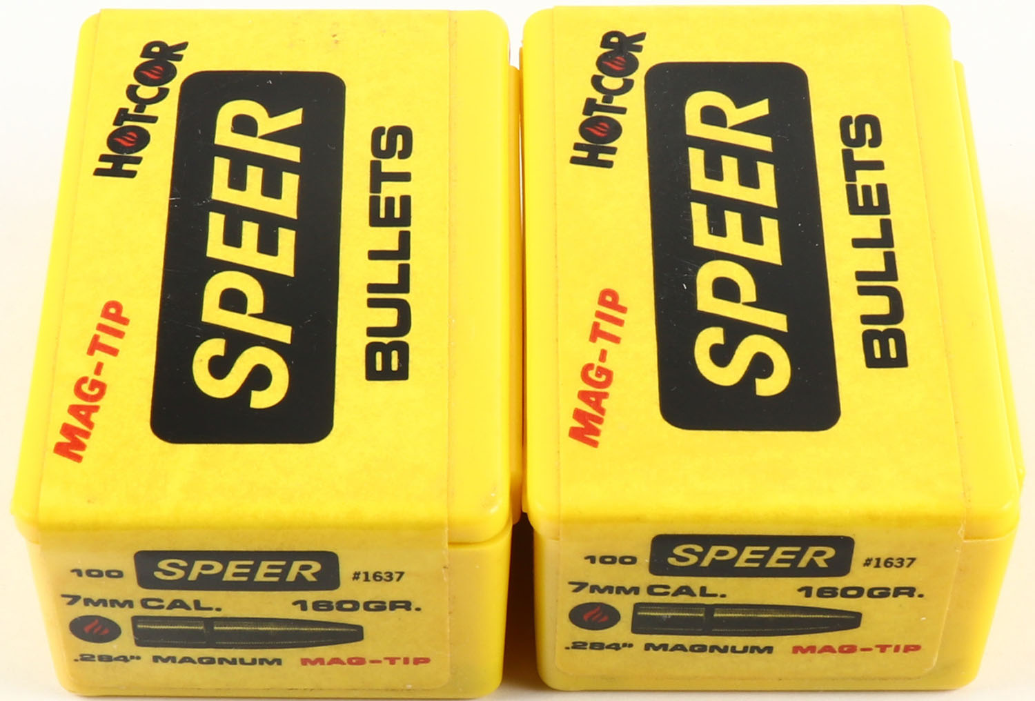 Speer, Lot of (2), 7mm Cal., 160 Grain .284'' Magnum Mag-Tip, FULL & SEALED, 1pc. Yellow plastic boxes with black & yellow sealing labels, boxes are MINT. Grade: MINT - Value: 20 to 60