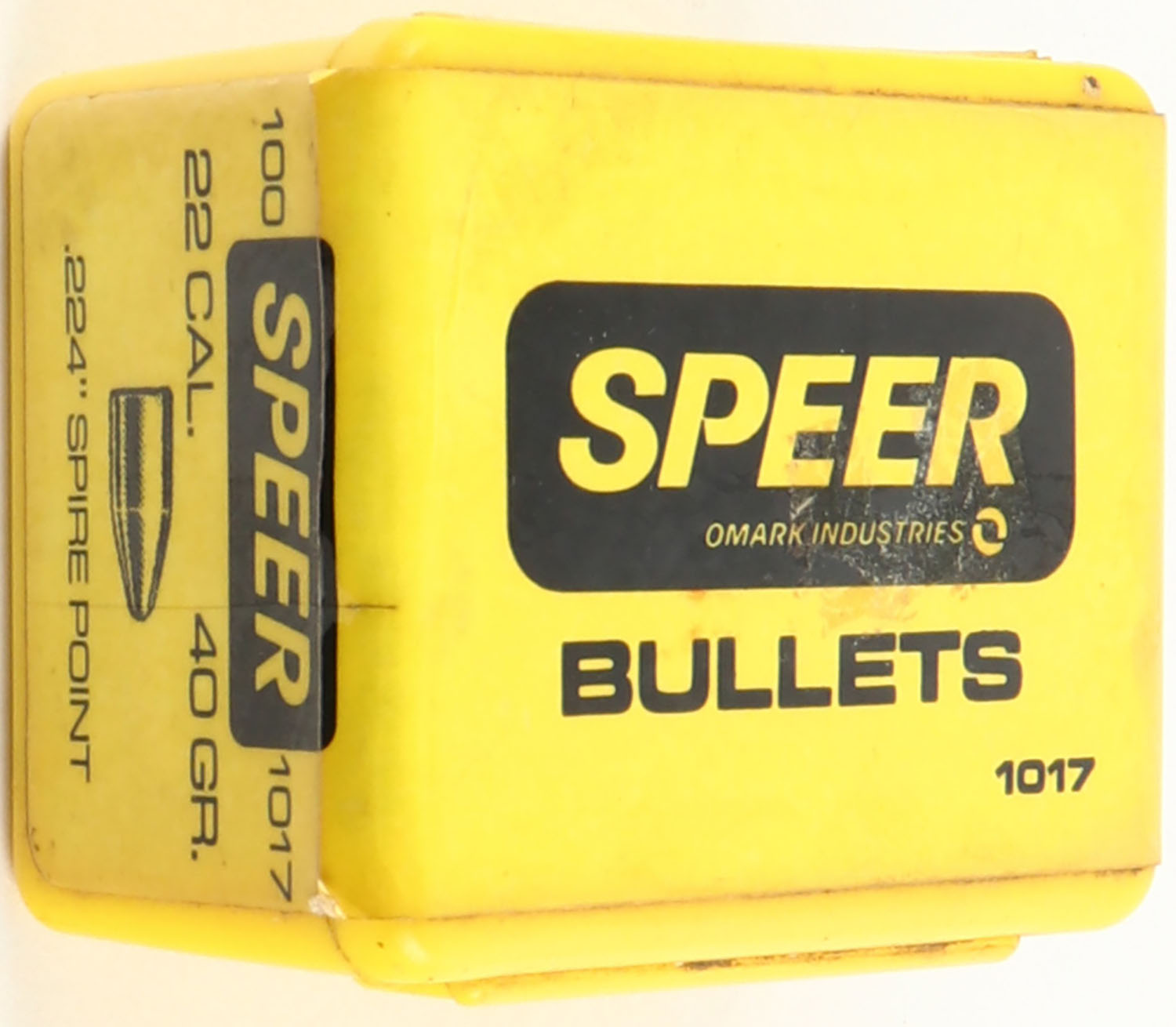 Speer, 22 Cal., 40 Grain .224'' Spire Point, Full, 1pc, Yellow plastic box with yellow & black sealing label, box is solid, bullets are excellent. Grade: Very Good - Value: 8 to 40