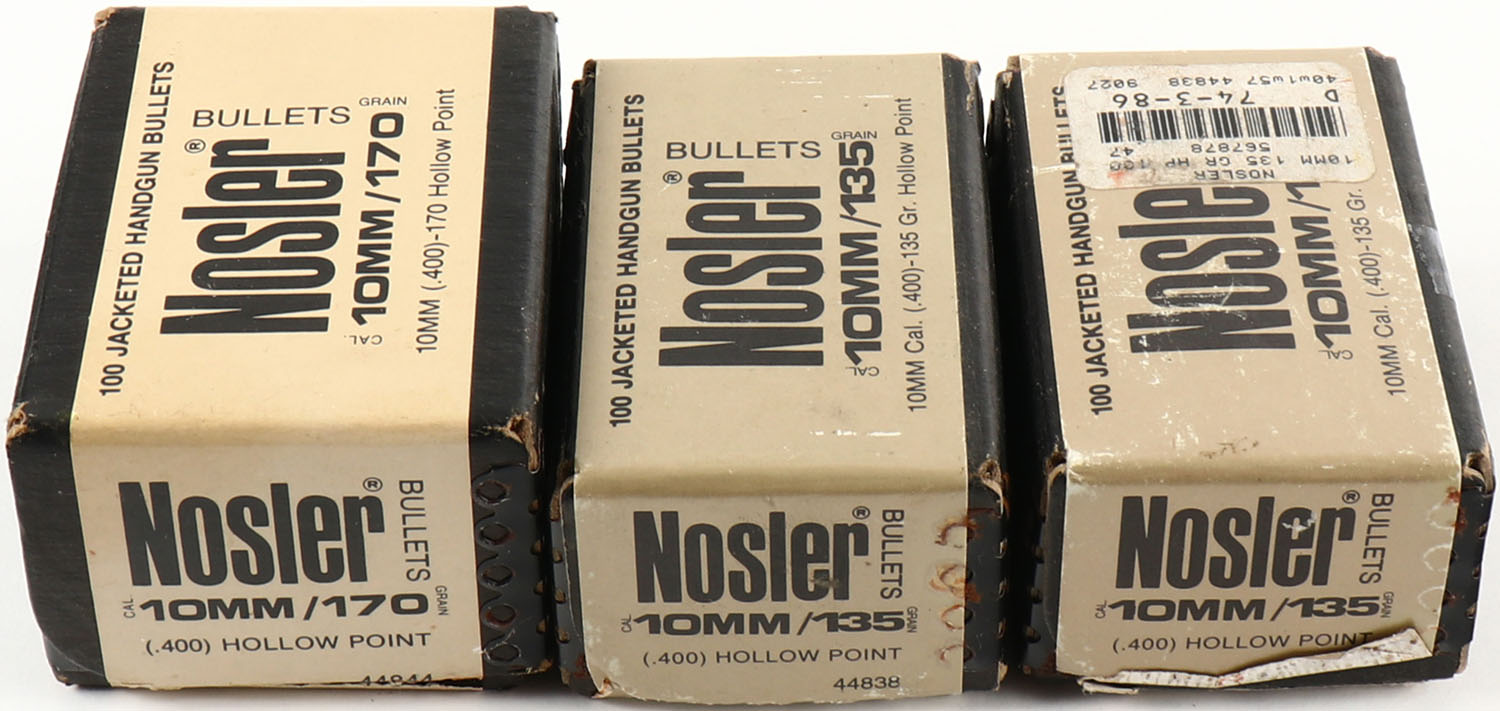 Nosler, Lot of (3), 10mm Cal., 170 & 135 Grain, .400'' HP, Full, 2pc, Black boxes with black & brown label, boxes are solid, bullets are excellent. Grade: Very Good ++ - Value: 20 to 60