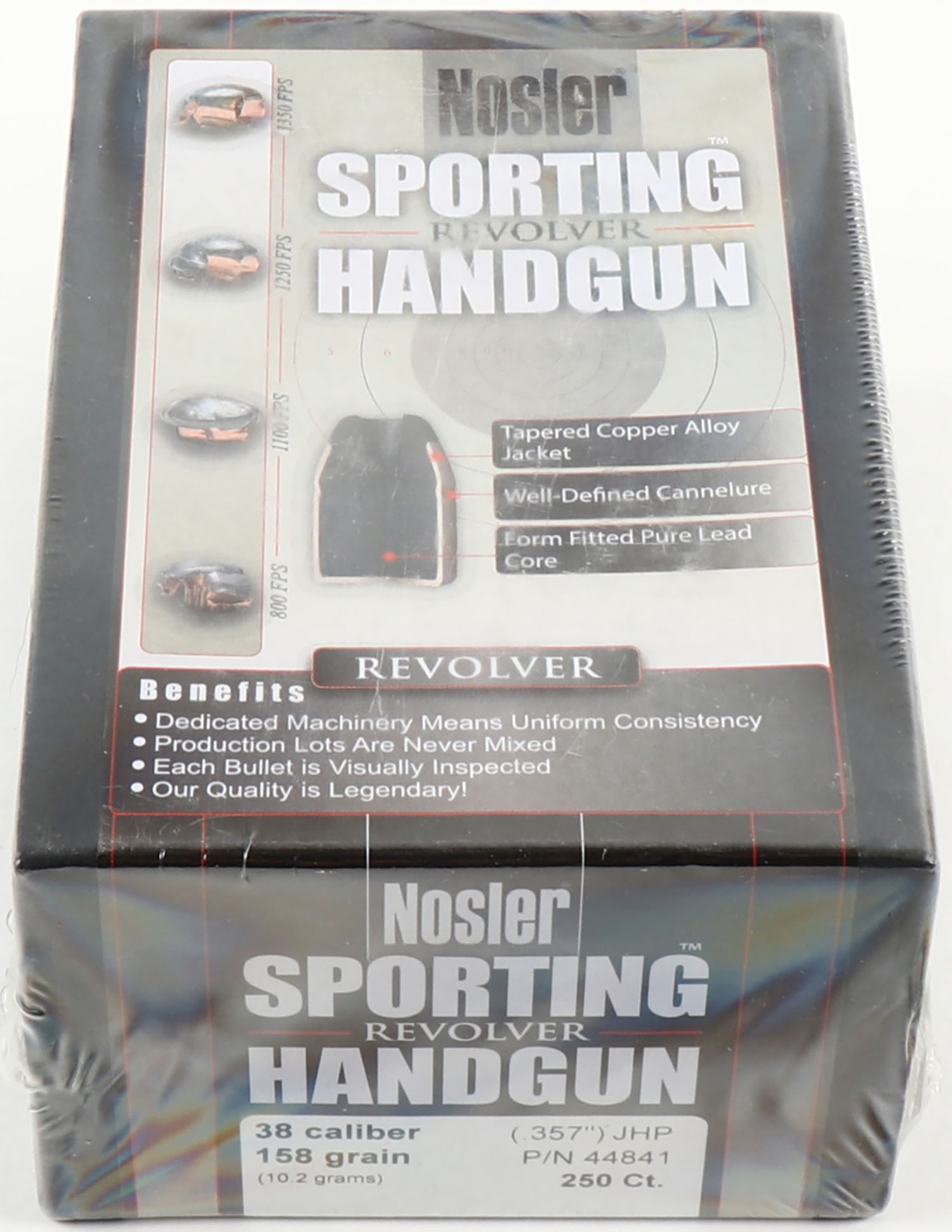 Nosler, 38 Cal., 158 Grain, .357'' JHP, FULL & SEALED, 2pc, Black box with multi-colored label, box is minty. Grade: MINT - Value: 20 to 100