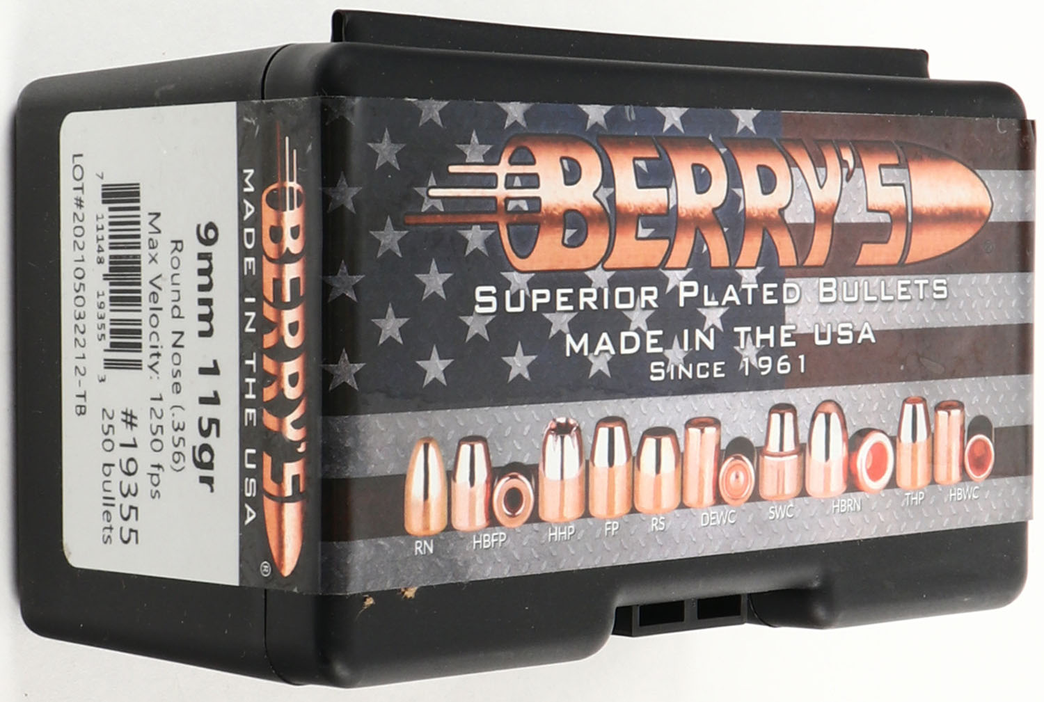 Berry's Superior Plated Bullets, 9mm, 115 Grain .356'' RN, FULL & SEALED, 1pc, black plastic box is minty. Grade: MINT - Value: 10 to 40