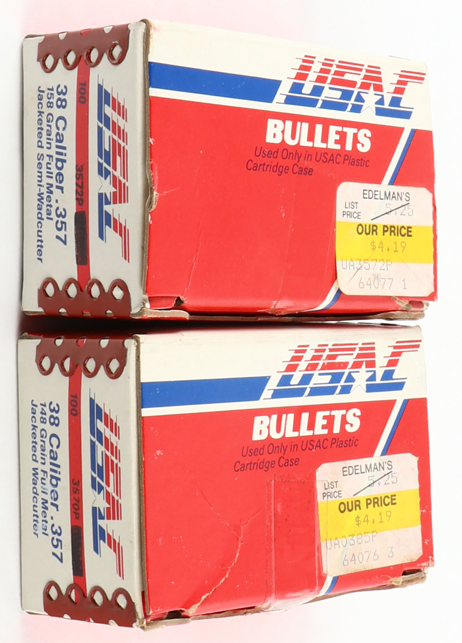 USAC, Lot of (2), .38 Cal., 148 & 158 Grain Full Metal, .357'' Jacketed Wadcutter, Full, 1pc, multi-colored boxes, boxes are solid, bullets are excellent. Grade: Very Good - Value: 10 to 40