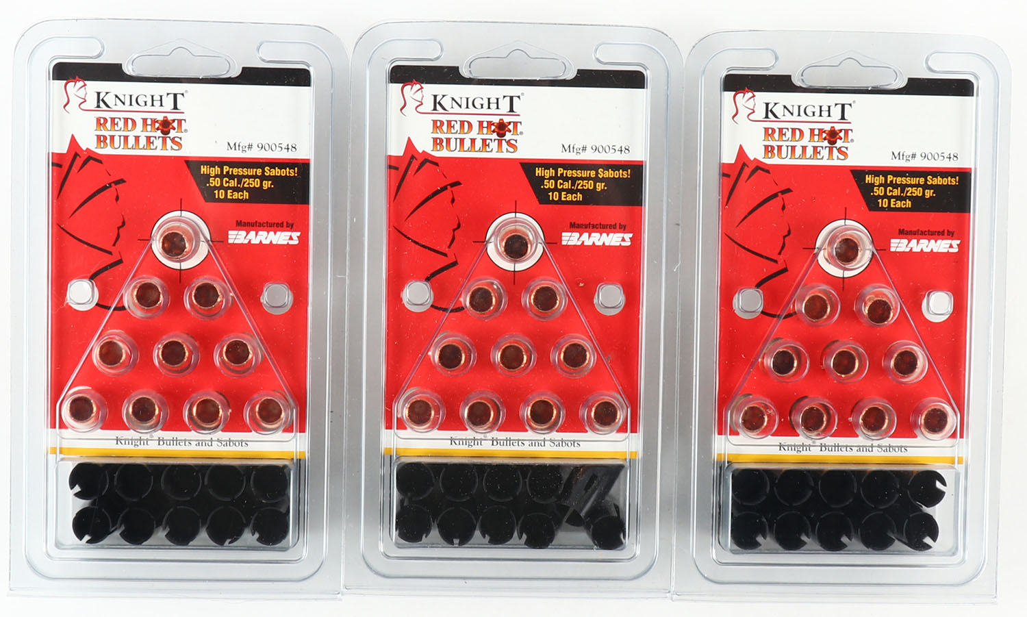 Barnes, Red Hot Bullets, Lot of (3), .50 Cal., 250 Grain, High Pressure Sabots, FULL & SEALED, 1pc, Plastic Cases are solid, bullets appear minty. Grade: MINT - Value: 20 to 80