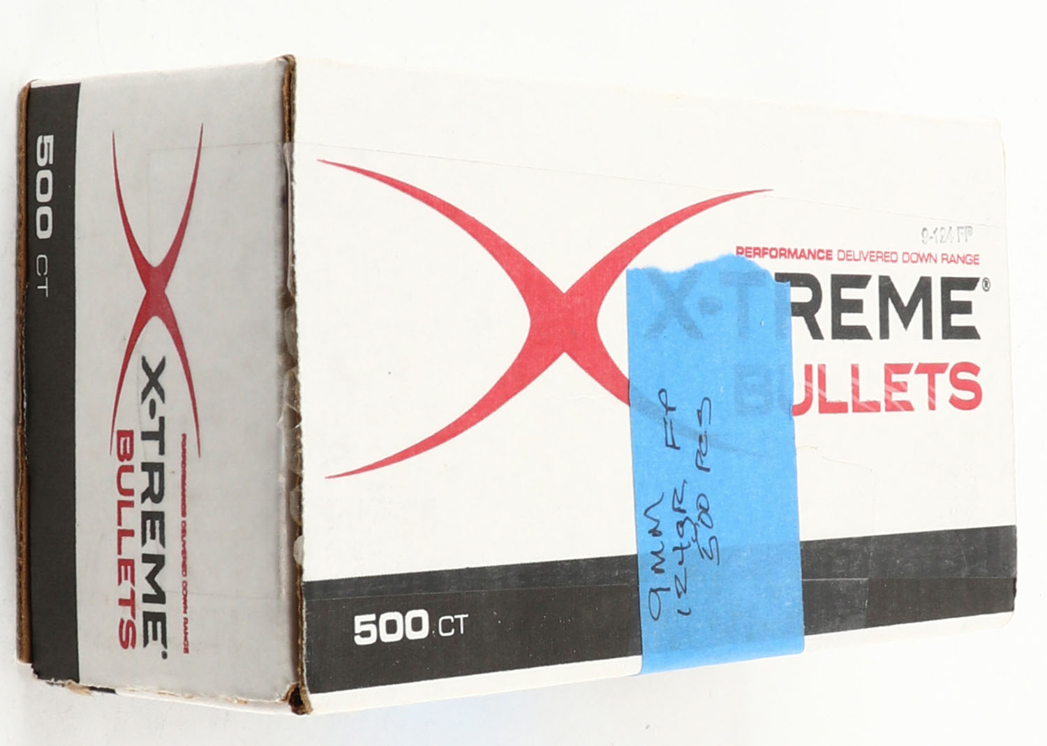 Large lot of X-TREME Bullets, 9mm, 124 gr, FP, box appears full and displays 500 ct. Grade: Mint - Value: 10 to 50
