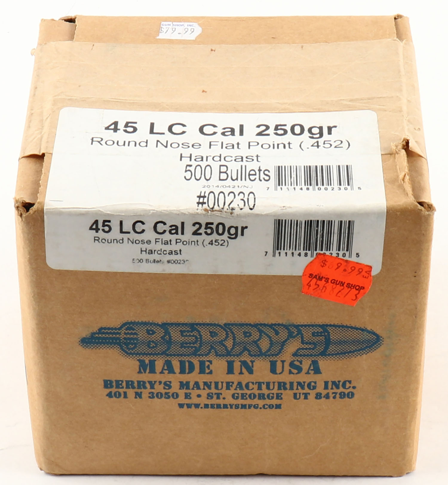 (1) Factory sealed box of Berrys Bullets, 45 LC Cal, 250 gr, (.452), round nose flat point hardcast, 500 ct. Grade: Mint - Value: 20 to 100