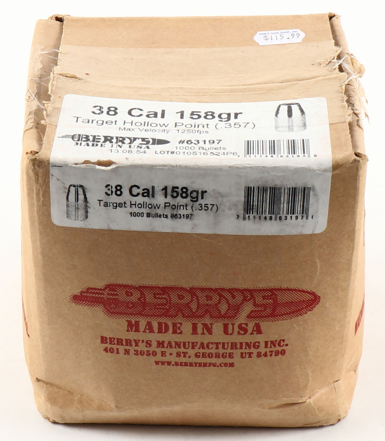 Large lot of Berrys Bullets, 38 Cal, 158 gr, (.357), target hollow point, box appears full and displays 1000 ct. Grade: Mint - Value: 40 to 120