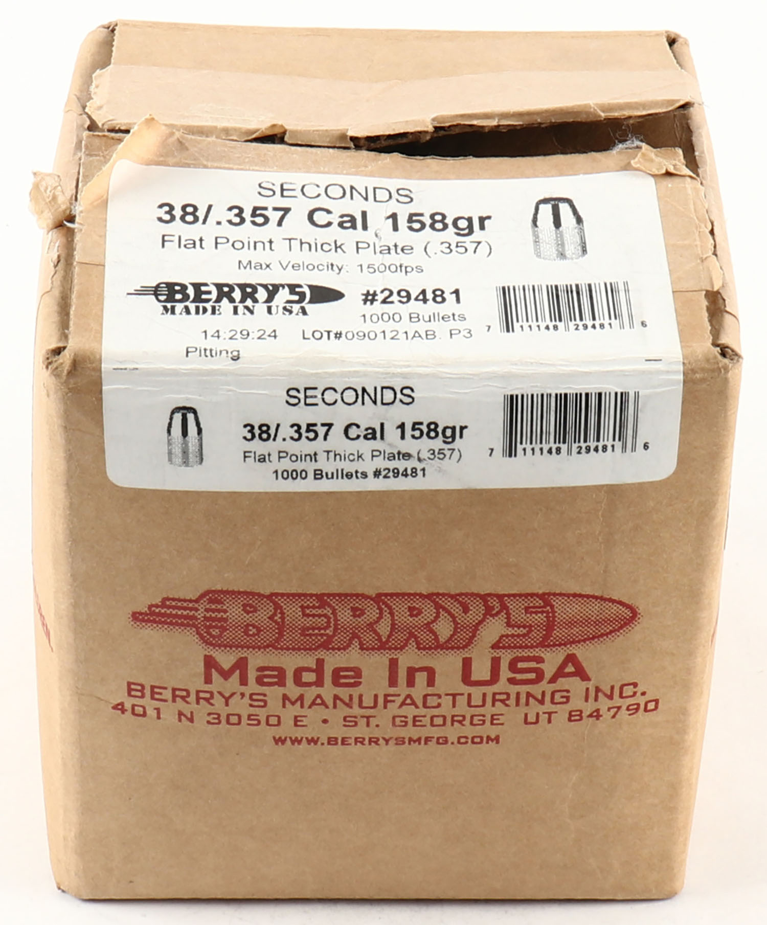 Large lot of Berrys Bullets, 38/.357 Cal, 158 gr, flat point thick plate, box appears full and displays 1000 ct. Grade: Mint - Value: 40 to 120