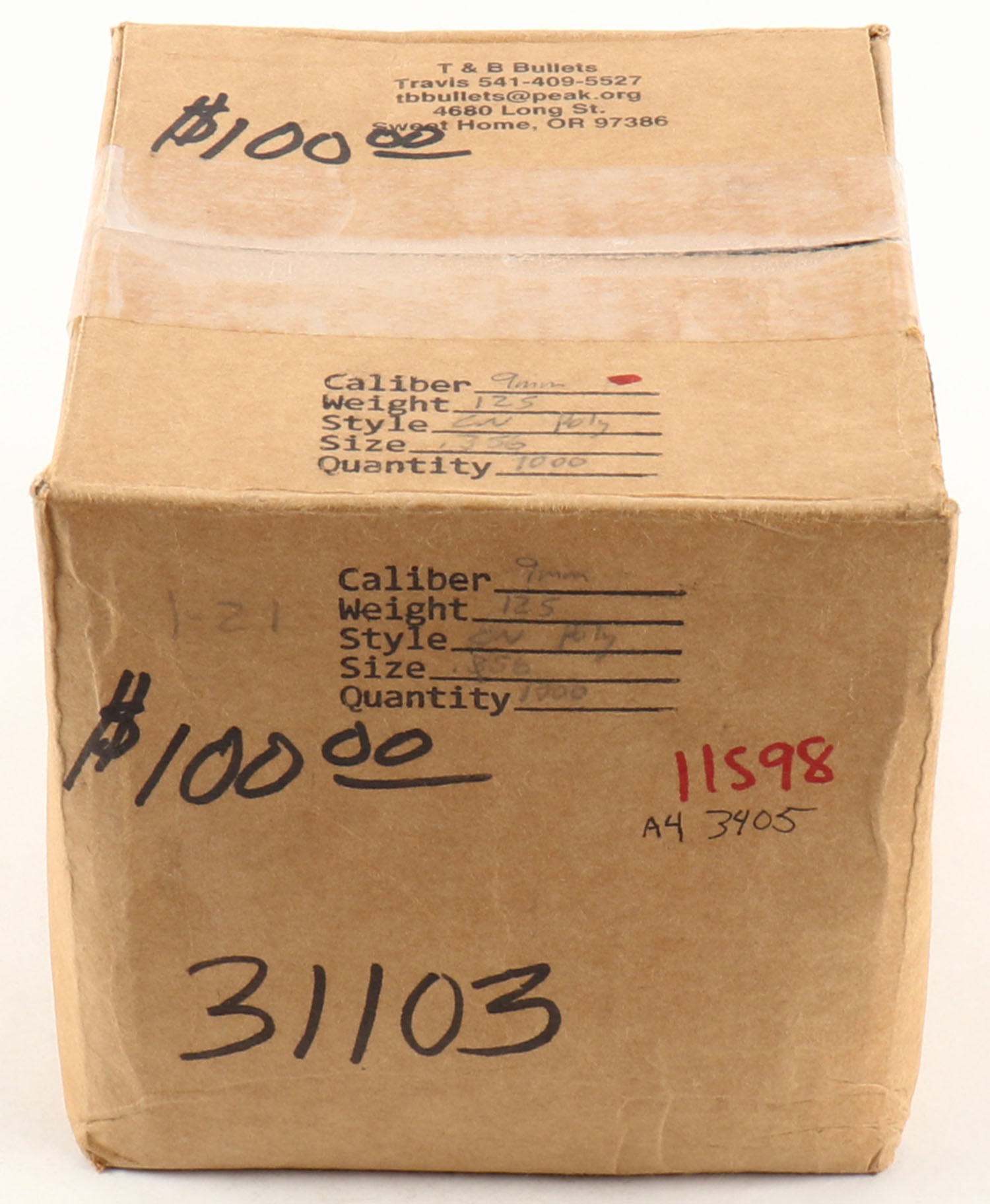 (1) Factory sealed box 9mm (.356), 125 gr, CN Poly, T & B Bullets, 1000 ct. Grade: Mint - Value: 20 to 60