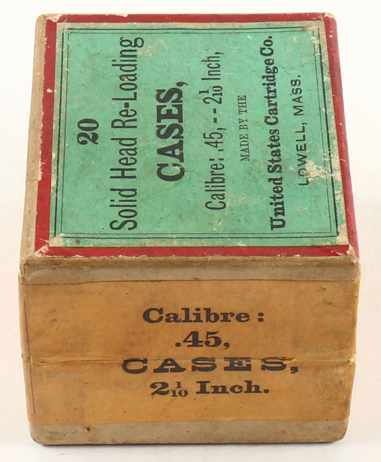 Lot of 20. US Cart., .45 cal. Solid Head Re-Loading CASES, 2 1/10 Inch, 2pc box, empty primed cartridges, Winchester, brass is excellent. Grade: Excellent - Value: 10 to 100