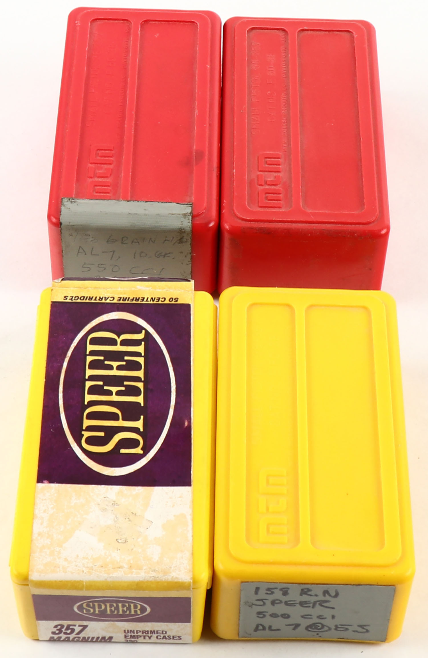 Lot of 4. .357 Mag and .38 Spl, (3) boxes of .357 MAG, fired brass, mixed H/S, no primers, (1) box of .38 Spl, fired brass, mixed H/S, no primers, brass good to excellent. Grade: Very Good ++ - Value: 2 to 20